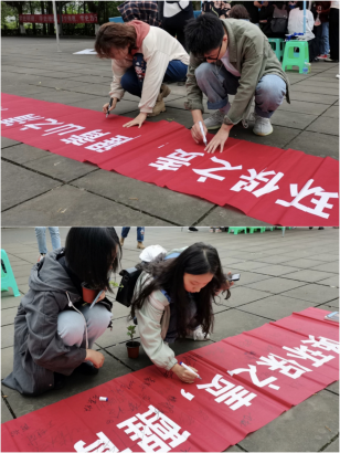 红色的横幅印着“唤环保之责,醒清山之青”的字样,同学们在上面慎重的签下自己的名字,这是对环保理念的认同,更是做出自己的承诺。龙飞凤舞的字体,富含诗书的青年,留下共同美好的夙愿,号召绿水青山,美丽移通,在环保意识形成中留下深刻的记忆,带动辐射更多同学加入其中,挥斥方遒的中国汉字,在这里筑成了最美绿色移通的保护墙。