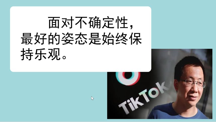 张旭老师主要分享了以下两点,一是“面对不确定性,最好的姿态是始终保持乐观”。张一鸣经历了很多未知的挑战,也许没把握,不知道怎么做,也不一定做成,但将知识与经历连点成线,能够更快地进入不熟悉的领域,从而提高效率。二是“效率就是把重要的事情做好”,高效不是用最少的时间做最多的事,而是以远大的目标为指引,做正确的事情,让正确的事情积少成多、互相关联叠加,产生复利现象。