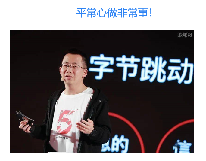 赵江芙老师用三个词来形容字节跳动的企业文化:低调、包容、务实。张一鸣本人非常低调且理性,在字节跳动9周年演讲中,他说道,“关于平常心,我首先想说的是,平常心对待自己。最基础的是,认识到每一个人包括自己,都是一个平常人。其实在我看来,大部分事情,都是有原因、有道理的,没有特别难以解释或者特别不寻常的部分”,张一鸣以平常心做非常事的状态值得我们学习。