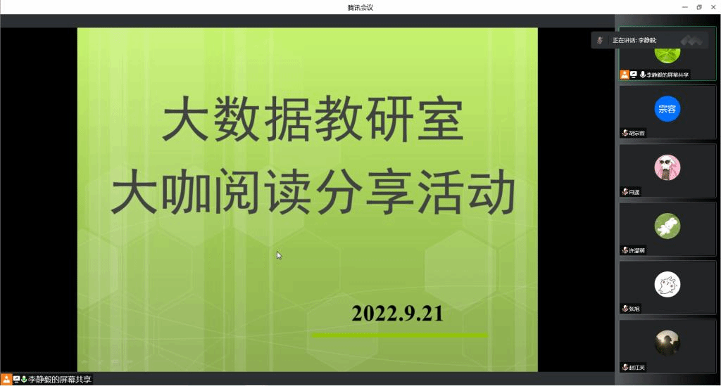 读史使人明志,读诗使人灵秀,哲学使人睿智,书籍让人成长,大咖阅读,一直在行动。为积极响应我校“信息产业大咖传记阅读计划”,提升专业课教师思考的深度和广度,丰富教学生活,9月21日下午,大数据教研室在线上开展了“大咖阅读分享活动”,活动由大数据教研室主任李静毅老师主持,大数据教研室全体教师参加。