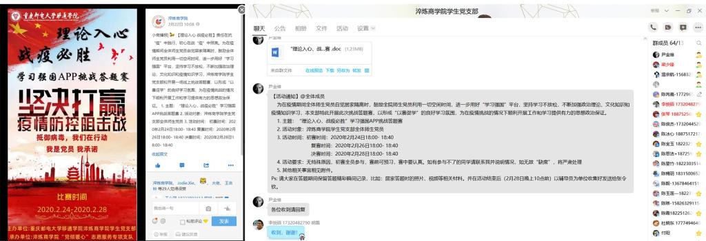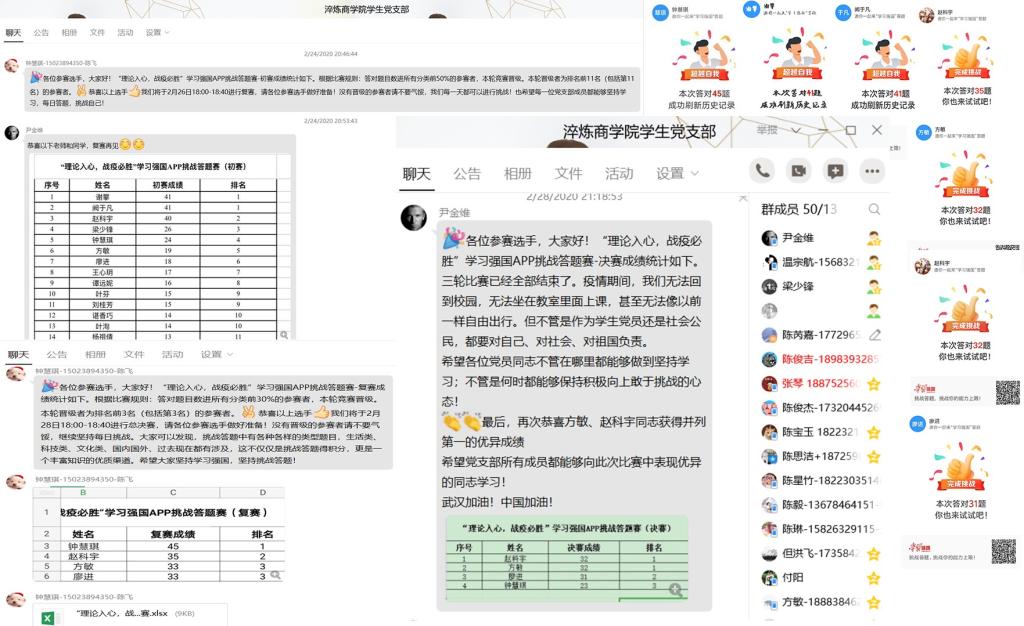 疫情就是命令,防控就是责任。新冠肺炎疫情防控是现阶段全国全党的重中之重,淬炼商学院学生党支部积极响应上级号召,为在疫情期间全体师生党员在家自觉隔离的同时,保持对疫情工作和疫情知识的了解和学习,不断增强师生党员的理论知识和党性修养,发挥党员先锋模范带头作用。2020年2月24日下午六点,由淬炼商学院学生党支部主办的“理论入心,战役必胜”学习强国APP挑战答题赛在线上拉开帷幕,本次比赛为期一周,分为初赛、复赛、决赛三轮,师生党员共同参与,同场竞技,形成了一股 “以赛促学”的学习热潮,激发了师生党员的学习热情。