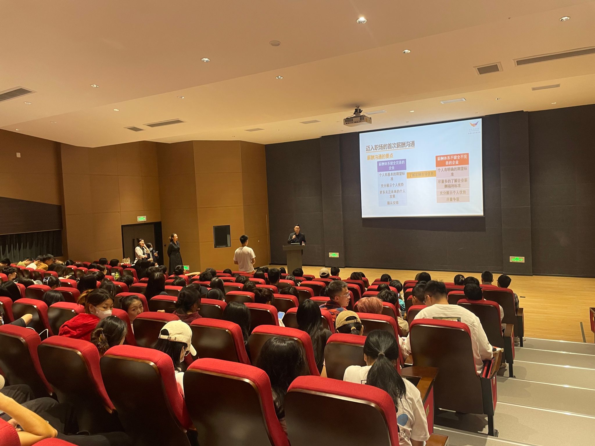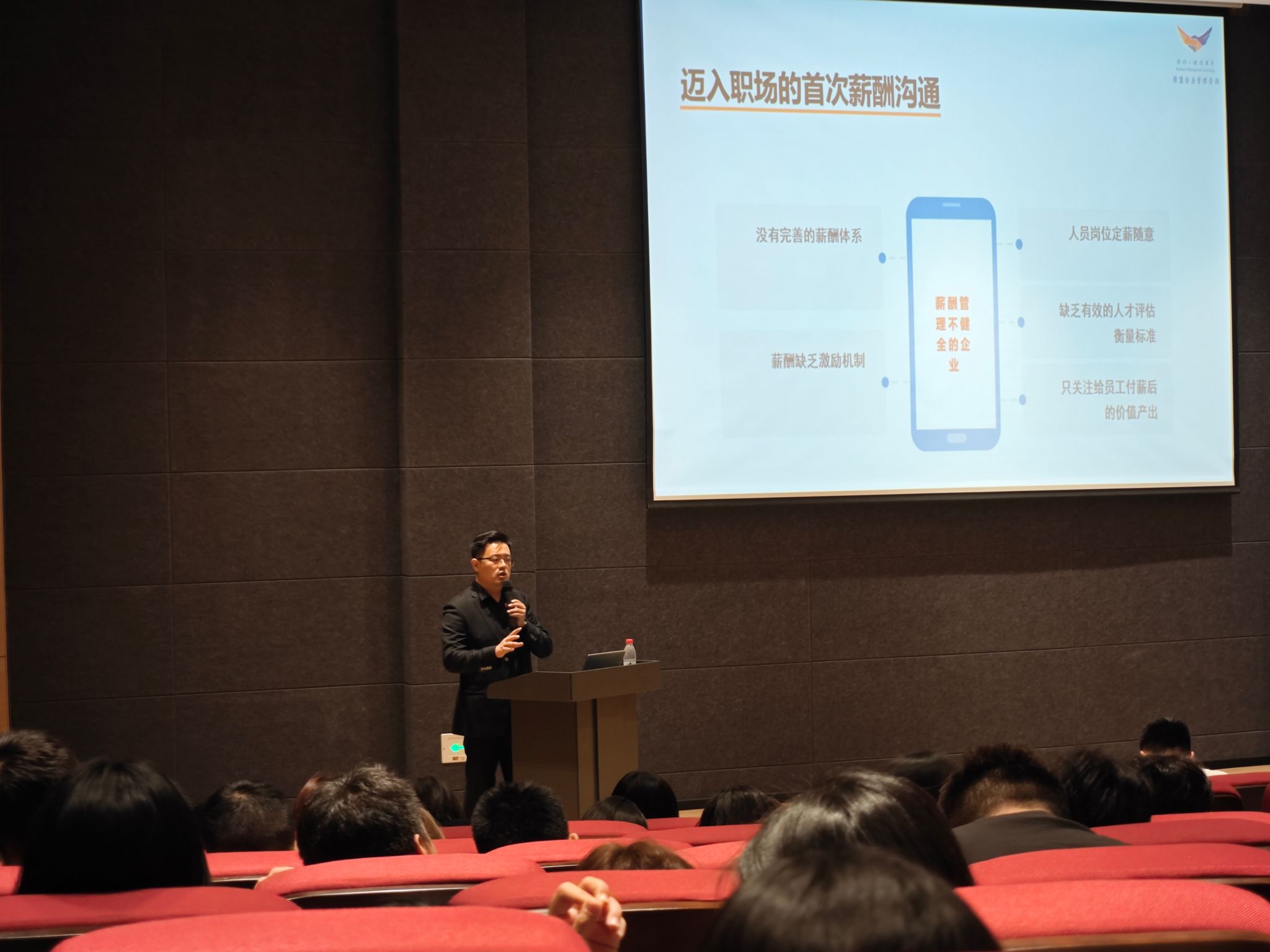 重庆得盟高管吴震源老师以“自我价值定位与薪酬沟通”为主题展开了《数智化企业的人力资源管理》的内容,在课程中,吴老师从分析自我、分析外部就业环境引入智能制造企业实例,鼓励同学们初入职场明确自我定位与方向。吴老师介绍了企业薪酬管理状况逐步引入迈入职场时应该从以下几个方面来与企业进行薪酬沟通,如确认自己加入该企业的意愿度、认真倾听企业HR介绍企业等,最后吴老师说到薪酬沟通的要点就在于自信从容、有礼有节、不卑不亢等。