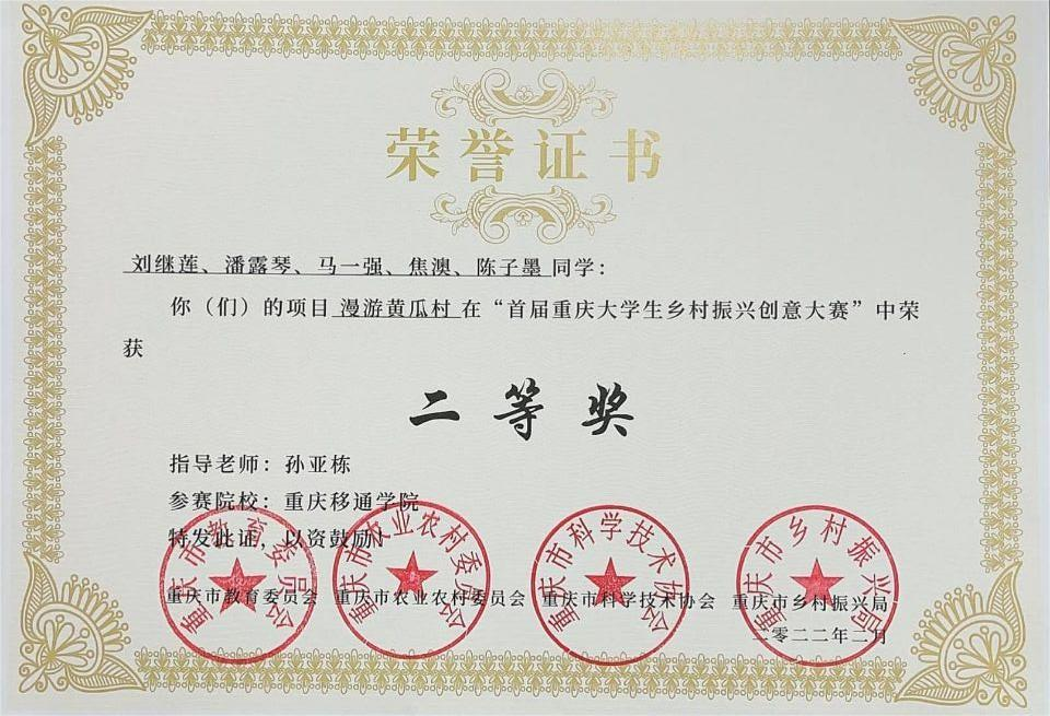 大二,应好友的邀请一同参与到重庆市首届大学生乡村振兴创意大赛中,带领团队(黄瓜山生产大队)通过走访当地调研,收集黄瓜山特色景点、考虑不同的景点性质、游玩项目内容,还有网上游客的评价,综合多方面考虑,选定有代表性的景点 于地图上定点,将其串联起来,成为一条走遍黄瓜山的游玩路线。根据黄瓜山传统的电子地图,进行手绘版地图山形地势轮廓形状的复原。根据不同的颜色进行区分,加上一些建筑和图案点缀,形成一副精致的卡通地图。运用 AE 软件,以手绘地图的路线为路径,制作 MG 效果动画,使用特效插件,增强画面效果。同时开设公众号进行推广,在策划撰写的同时我们团队进行了无数次的收集黄瓜村信息,前往黄瓜村对当地特色,特色文化等调研,参考其他乡村振兴乡村寻找灵感,多方面入手在修改50余次修改后完成了作品。最终以校赛第一的成绩进入市赛,代表学校参赛,获首届重庆市大学生乡村振兴创意大赛二等奖的佳绩。同时作为黄瓜山生产大队的负责人,我们通过与当地联系将其作品—漫游黄瓜村也投入到实地运用中,促进当地黄瓜村的旅游业发展,促使当地超50万元的经济流动,带动当地经济发展。