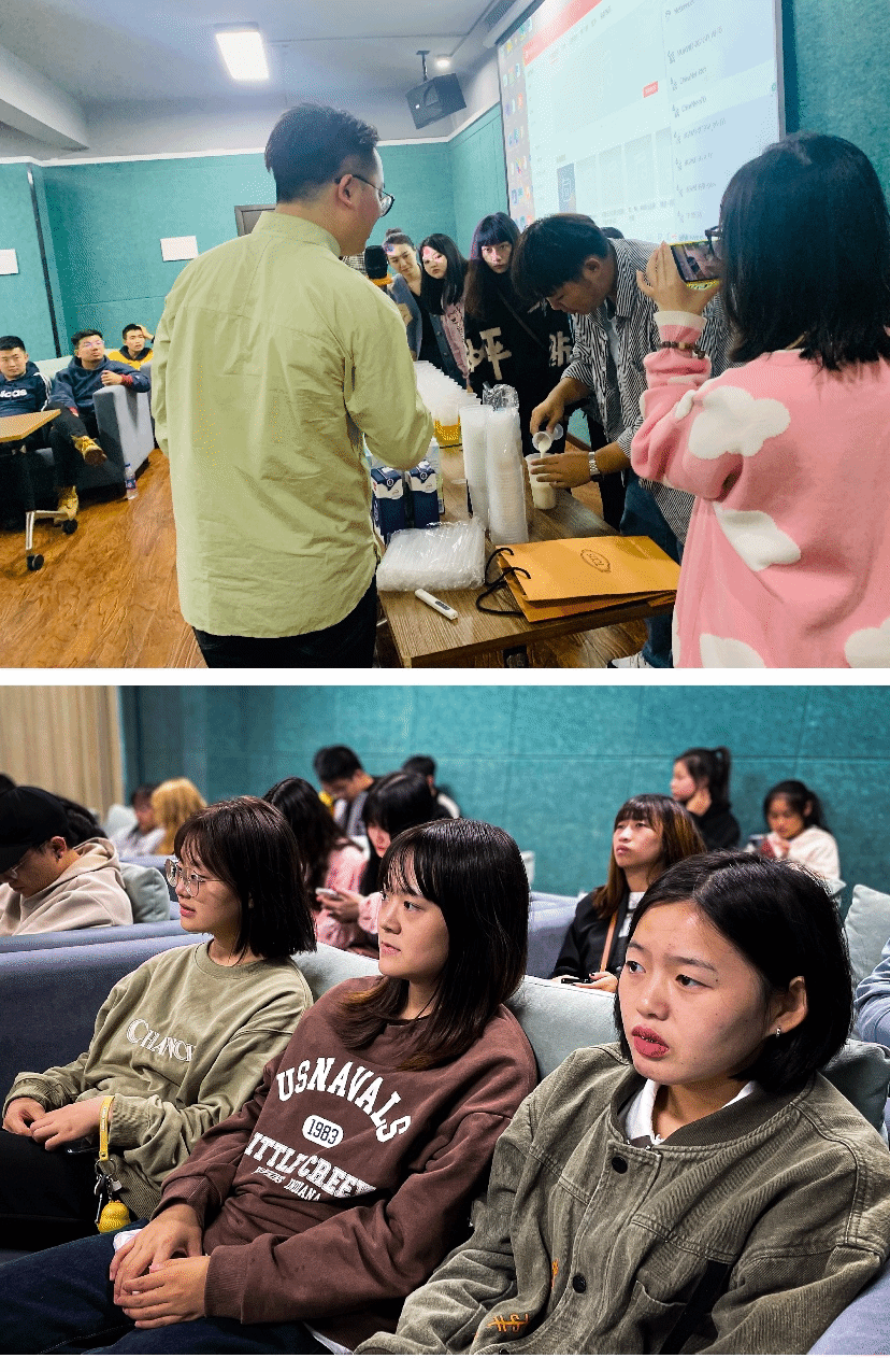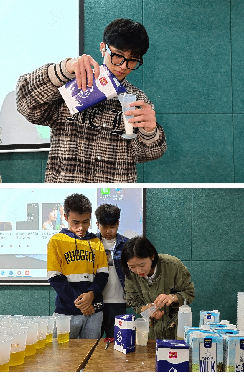 “老师,这个20毫升够吗?”同学们在现场一边动手制作着奶茶,一边问道。“喜欢比较甜的同学可以加到25毫升,但一定不要超过30毫升,各种原料比例会影响奶茶口感。”杨杰老师在一旁耐心指导着。“你试试我做的”、“我觉得她这个更好喝”……制作区前,同学们踊跃参加奶茶的制作过程,热闹非凡。杨杰老师一边为同学们做示范,一边讲解奶茶的调配比例。看着同学们认真谨慎的样子,杨杰老师开玩笑的说:“这真像是在培训自己的员工……”房间里,奶茶的醇香回荡在空气中,悦耳的音乐相伴着同学们热情又忙碌的身影,时间在这一刻满是温柔。看着自己亲手制作的奶茶,同学们的脸上洋溢着幸福、满足的笑容,还有同学拿出手机一顿狂拍,说要记录下这珍贵的时刻。品舌尖美味,鉴美好生活。秋冬天冷,希望同学们选择对身体无害的饮品,温暖过冬。