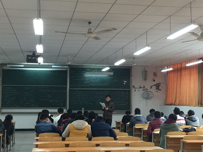 11月29日上午,通信与信息工程系2016年考研专业课辅导迎来了最后一堂课,席兵副教授在讲台上悉心地讲解分析着考研复习题,板书写满了四块黑板,同学们聚精会神地听着课。此时,通信与信息工程系系主任毛期俭教授,主任助理李文娟老师,教学秘书李佩婷老师,毕业班辅导员周极、蒋益和杜涵老师也纷纷来到了上课的4402教室,待课程结束,毛期俭主任为12月即将参加研究生入学考试的同学加油鼓励,召开了考前动员大会。