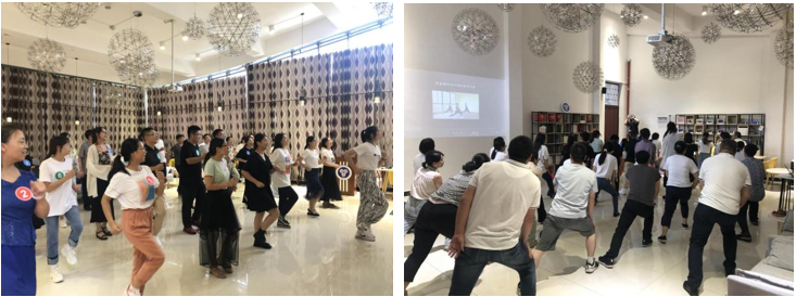交流会开始之前,老师们在辅导员吴生亮老师的带领下做热身操,活动筋骨,各位老师完成队伍组建以后踊跃参与紧张而刺激的互动游戏,在“五毛一块”、“一圈到底”等互动游戏中,现场响起老师们此起彼伏的笑声。通过简单的互动,老师们从开始的拘谨,已经逐渐变得更加熟络,团体的凝聚力与协作能力也得到了明显提高。