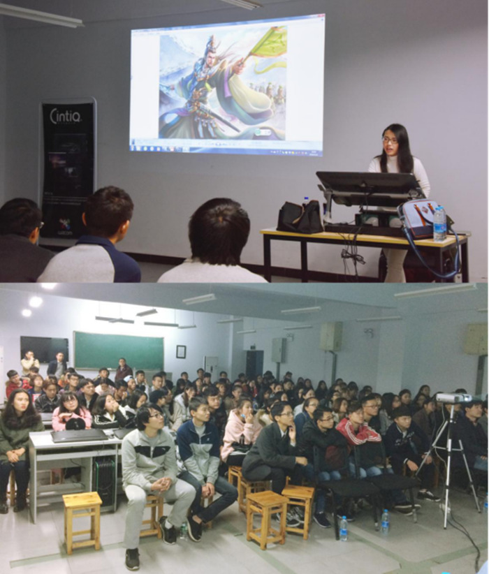 罗琛又名琛·美弟奇是职业插画师,桌游《三国杀》官方插画师,桌游资讯杂志《桌游志》官方签约画师,游戏资讯杂志《游戏人》、《UCG》特约插画师。她首先分享了个人创作的插画作品,这些脍炙人口的作品时常出现在同学们的手机中,罗老师一边播放插画一边讲解其中创作灵感的来源。这些插画细节丰富、构图精美,同学们对这些创作方式产生了浓厚的兴趣。