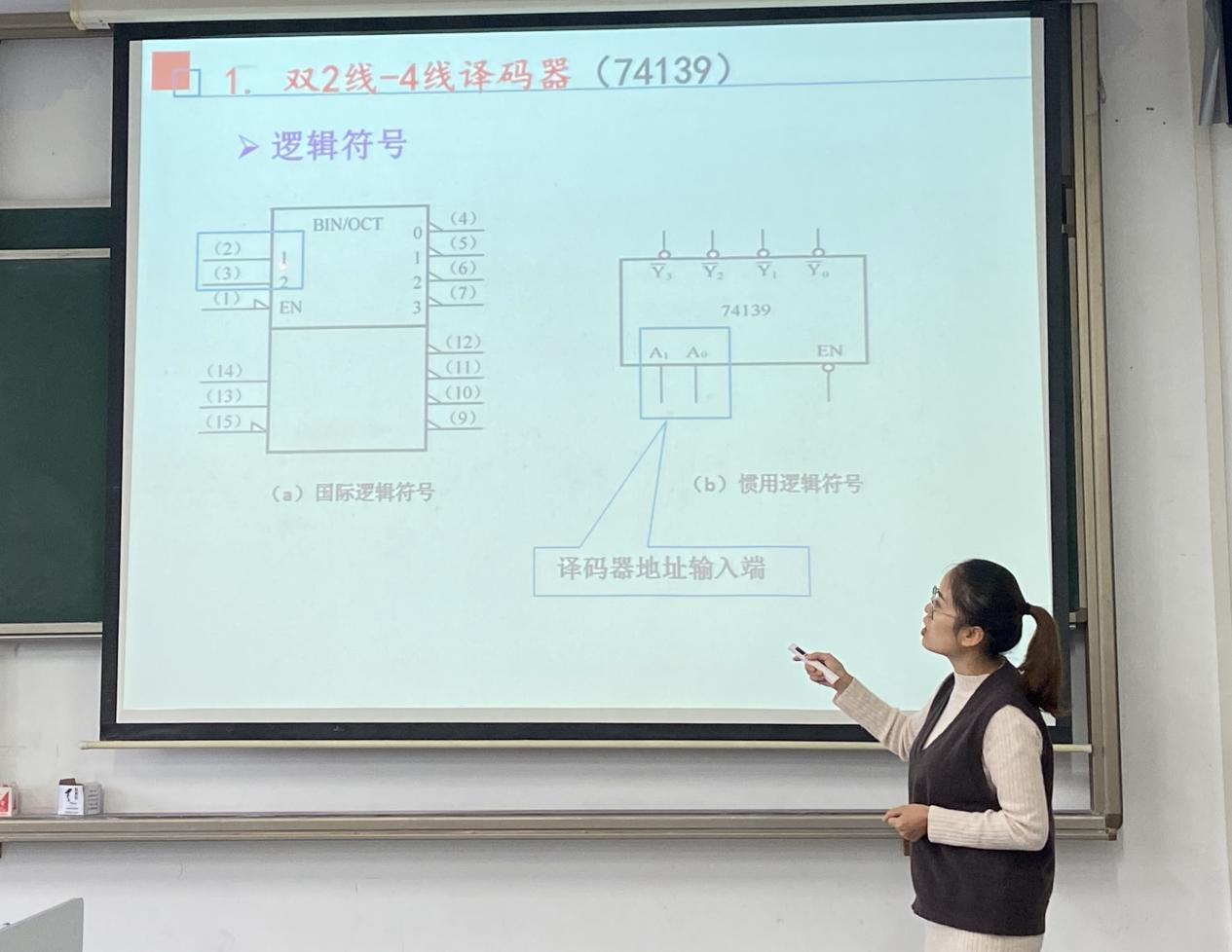 本次活动由三个部分组成。10月20日下午,远景特级教师鲜娟老师以《数字电路与逻辑设计》课程中的“译码器”为题在第一实验楼S1501开展了一场示范课活动,示范课上鲜娟老师清晰明了地讲解了各种译码器的逻辑符号、逻辑功能以及生活中的一些实例,鲜娟老师将理论讲解、虚拟仿真演示、实践应用分析相结合的教学方法给各位老师起到了很好的示范作用。