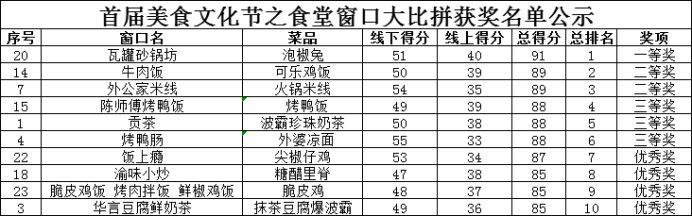 活动最后,欣赏优美的扬琴表演同时,本次活动也到了尾声。随着工作人员紧张而漫长的结果计算后,根据现场得分+投票得分,最终活动前三名的窗口分别是:一等奖是瓦罐砂锅坊,二等奖是牛肉饭和外公家米线,三等奖是陈师傅烤鸭饭、贡茶和烤鸭肠。活动随着名次的公布也正式结束,本次比赛不仅拉进了食堂、老师、同学的距离,而且在三方共同的努力下让更多的学生知道安全饮食的重要性。