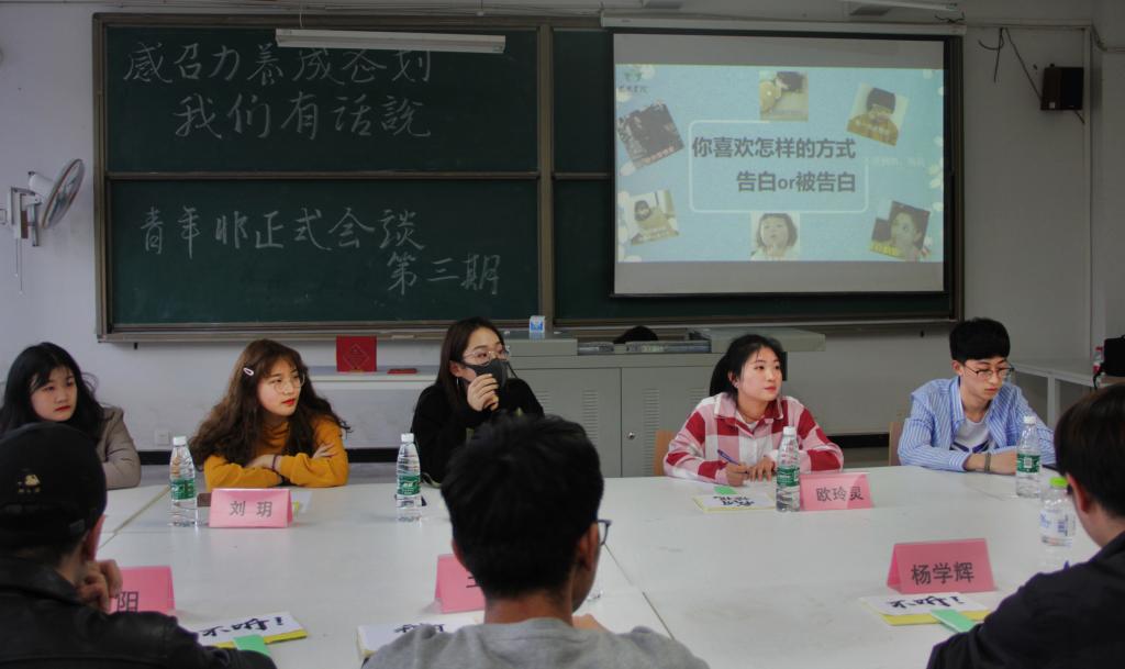 本次非正式会谈分为两部分,第一轮选手们表述自己喜欢的告白方式,第二轮分享自己见到过的或是经历过怎样的告白方式。在这两轮的分享中,大家由一开始害羞的私语变得可以侃侃而谈,说到某个时候,脸上还会流露出一丝丝或甜蜜或遗憾的笑容,或许是想起一些曾经美好的回忆,触碰到内心最柔软的部分了吧。