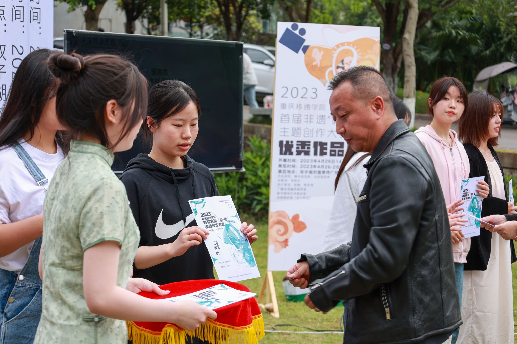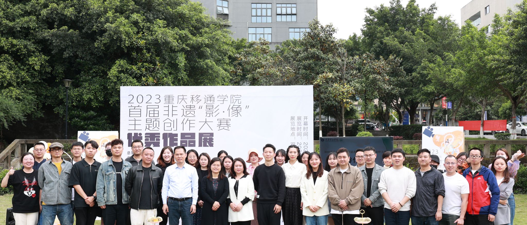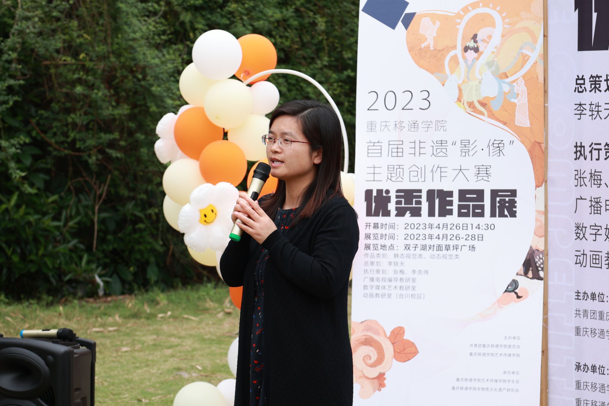 4月26日,重庆移通学院首届非遗“影·像”主题创作大赛优秀作品颁奖典礼在双子湖对面草坪广场开幕。出席颁奖典礼的有合川区文旅委党委委员副主任周福学、合川区非物质文化遗产保护中心副主任熊小红及科员陈忆源、合川区艺术团副团长张丽娟;重庆移通学院校长助理刘枚、地域文化与城市发展研究院院长彭伟、艺术传媒学院院长李轶天、副院长张梅和李克伟。重庆移通学院校长助理刘枚开幕致辞。