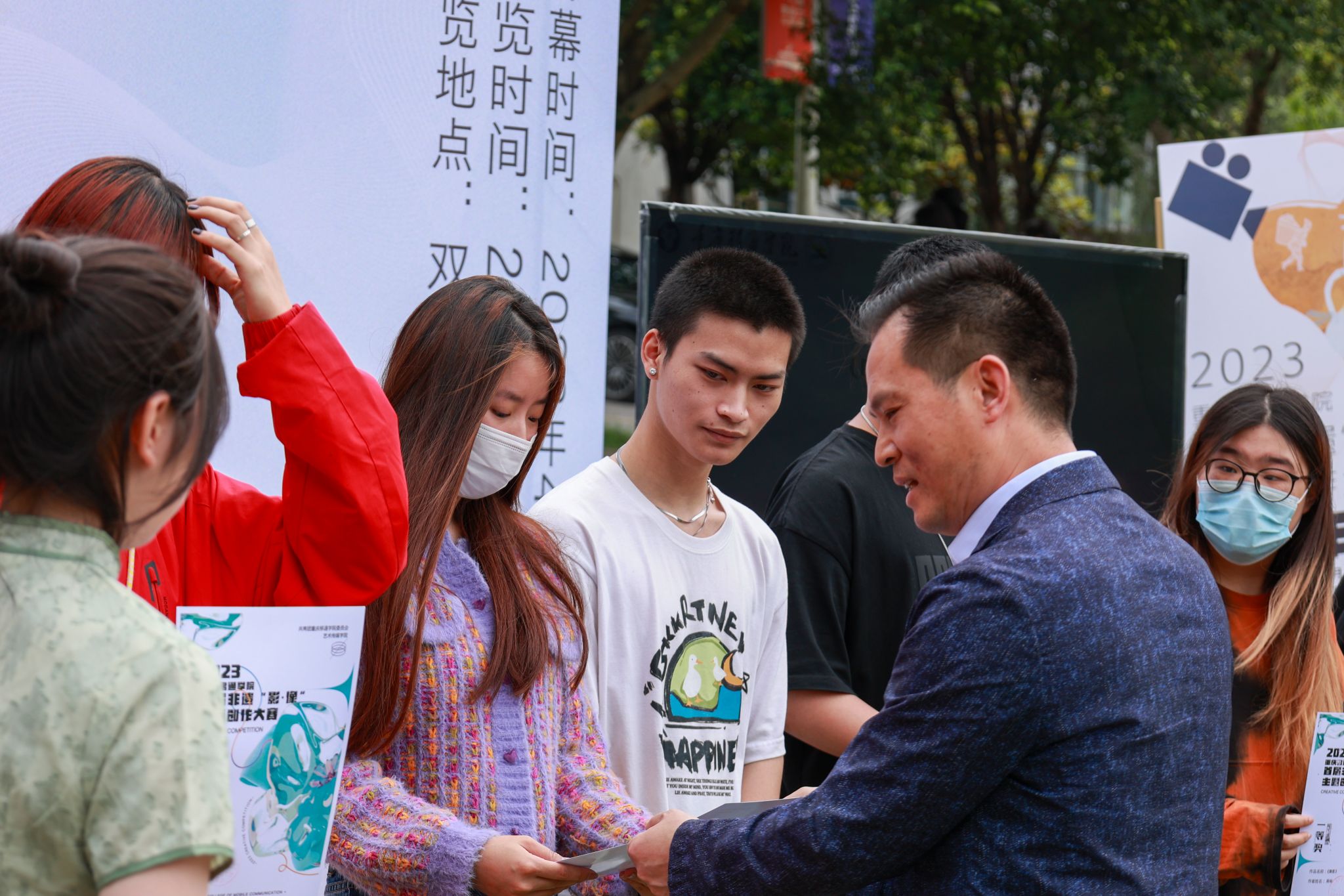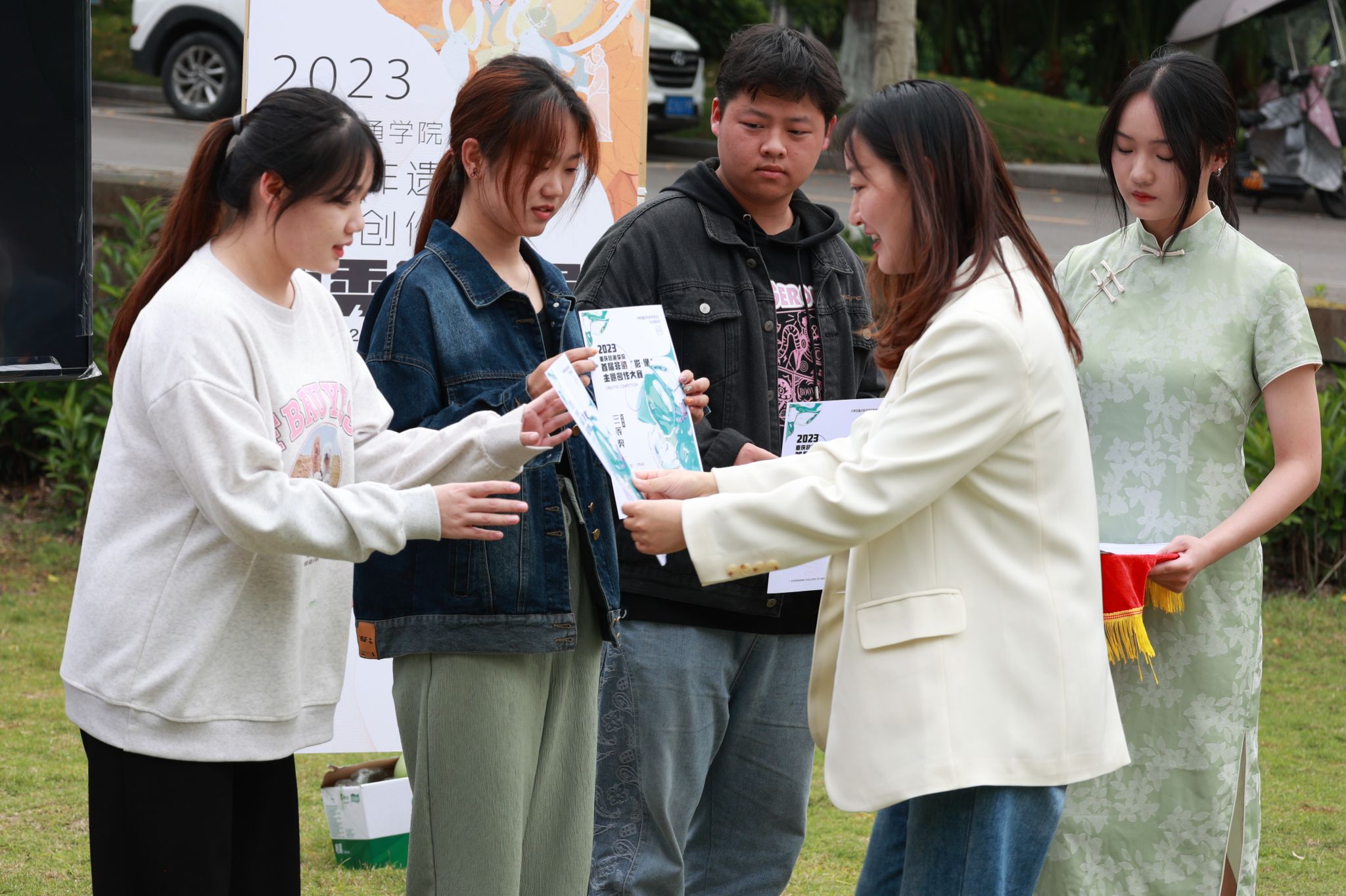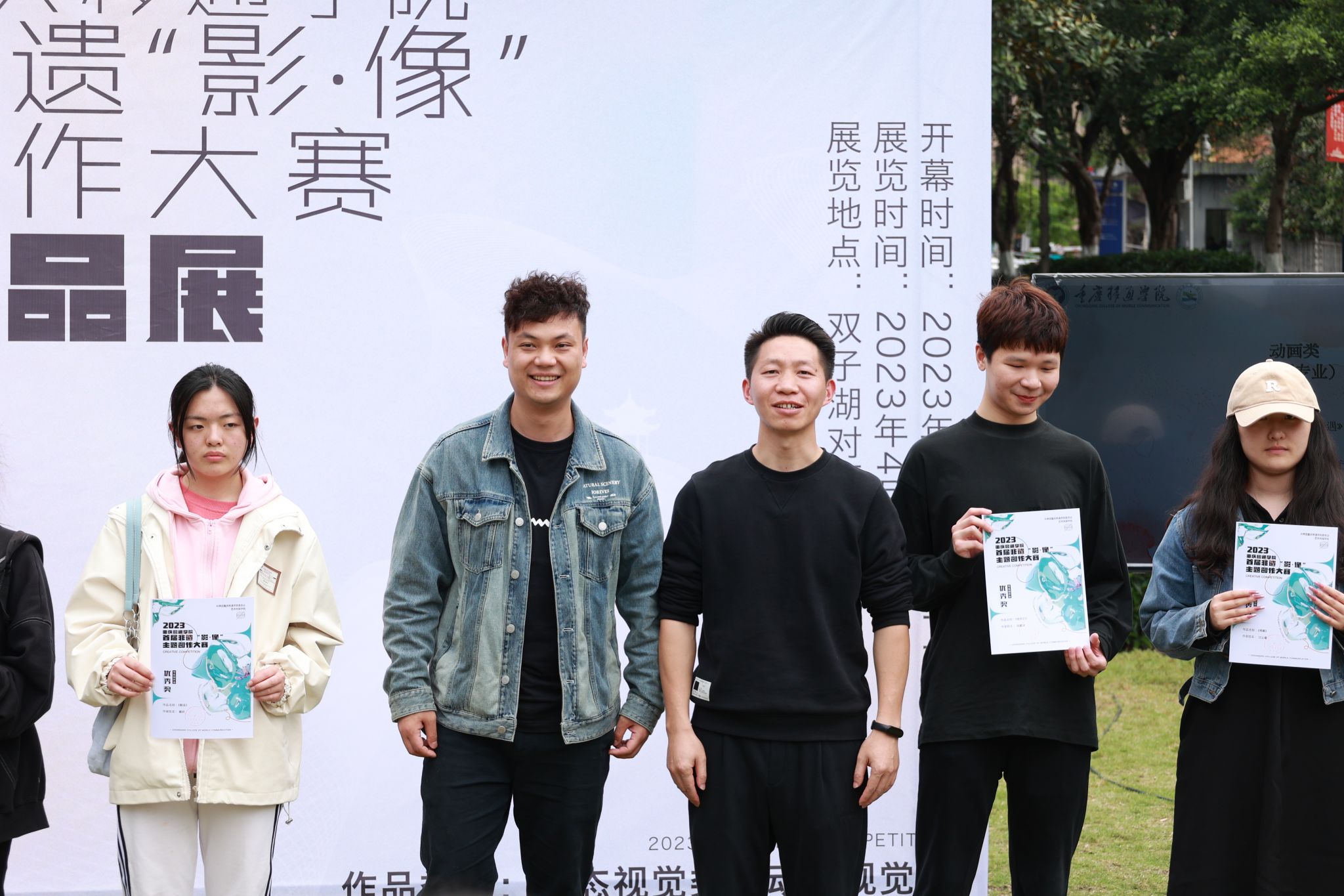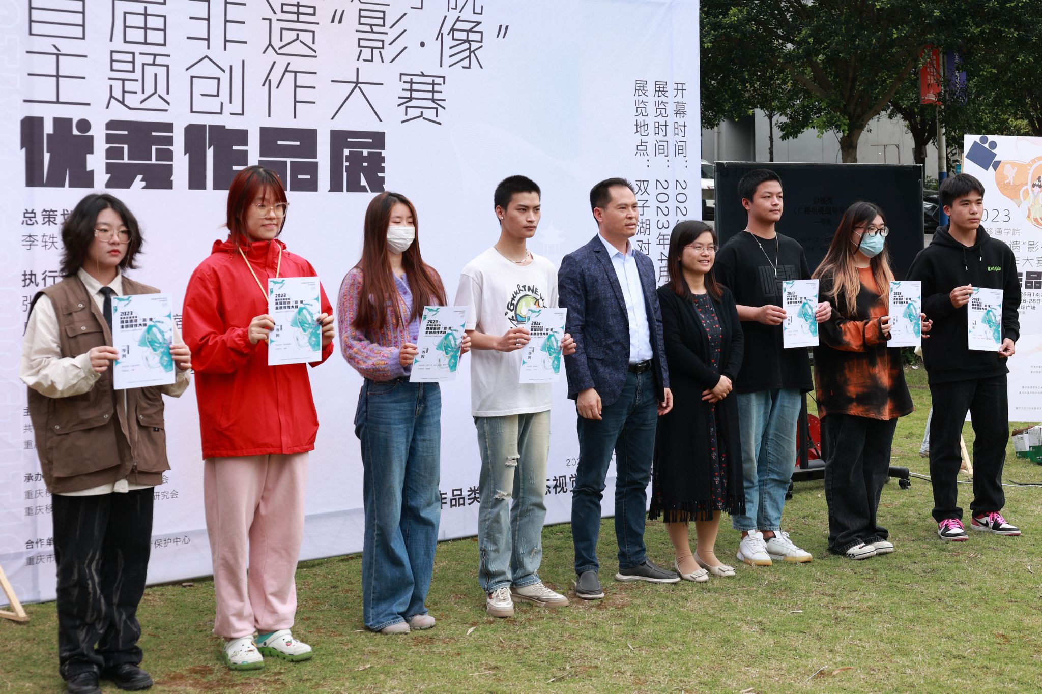 4月26日,重庆移通学院首届非遗“影·像”主题创作大赛优秀作品颁奖典礼在双子湖对面草坪广场开幕。出席颁奖典礼的有合川区文旅委党委委员副主任周福学、合川区非物质文化遗产保护中心副主任熊小红及科员陈忆源、合川区艺术团副团长张丽娟;重庆移通学院校长助理刘枚、地域文化与城市发展研究院院长彭伟、艺术传媒学院院长李轶天、副院长张梅和李克伟。重庆移通学院校长助理刘枚开幕致辞。