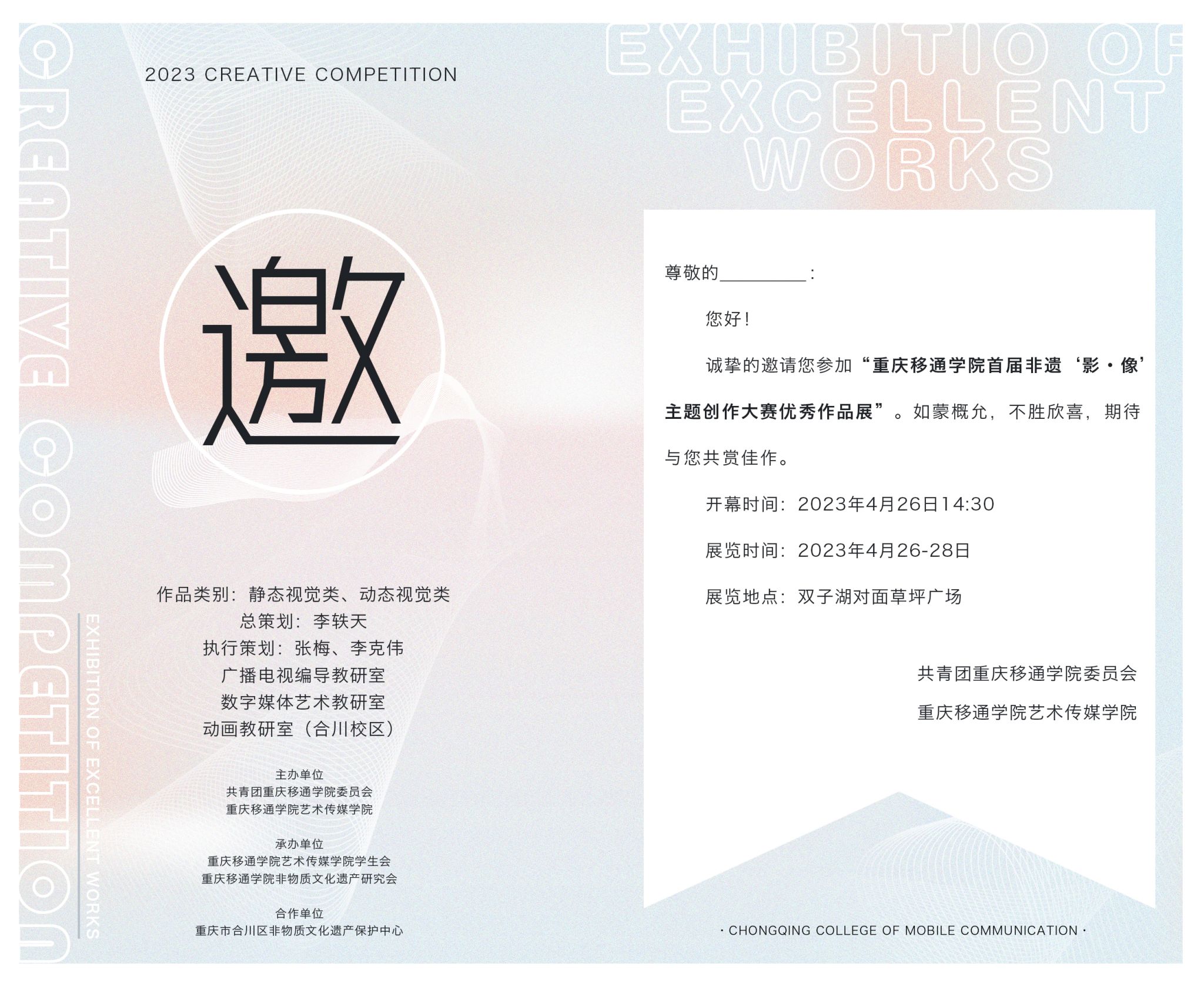 国潮兴起,给了非遗传承一个很好的时机。 “实现非遗在高校的活态传承,让年轻的声音被更多人听见。”由共青团重庆移通学院委员会,重庆移通学院艺术传媒学院主办了本次非遗“影·像”主题创作大赛。大赛及优秀作品展由艺术传媒学院院长李轶天总策划,张梅、李克伟副院长执行策划,重庆移通学院艺术传媒学院学生会及重庆移通学院非物资文化遗产研究会承办,并与合川区非物资文化遗产保护中心合作,搭建起从高校到政府的文化联动平台。