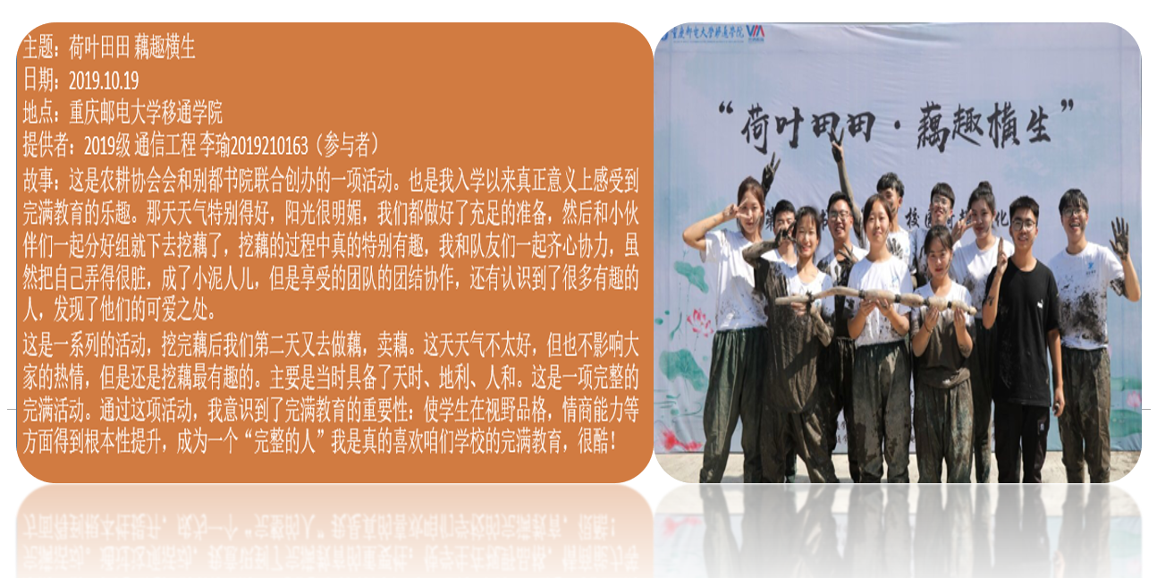 这是农耕协会会和别都书院联合创办的一项活动,也是我入学以来真正意义上感受到完满教育的乐趣。那天阳光很明媚,我们做好了充足准备,一起分组挖藕。挖藕过程特别有趣,与队友们齐心协力,虽然把自己弄得很脏,成了小泥人儿,但是很享受团队的欢快,认识到了很多有趣的人,发现了他们的可爱之处。第二天又去做藕,卖藕。天气不太好,但不影响大家的热情。通过这项活动,我意识到了完满教育的重要性——使学生在视野、品格、情商和能力等方面得到全面提升,成为一个“完整的人”,我真的喜欢学校的完满教育,很酷!