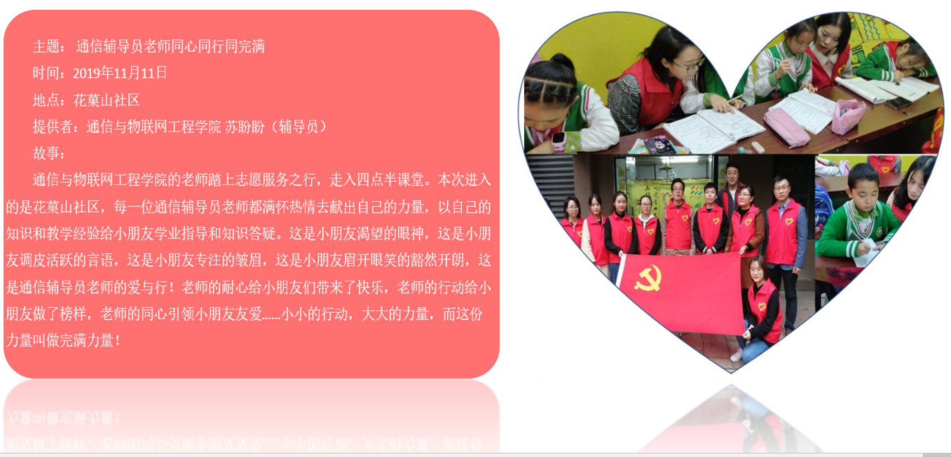 通信与物联网工程学院辅导员老师踏上志愿服务之行,走入四点半课堂。本次进入的是花菓山社区,每一位通信辅导员老师都满怀热情去献出自己的力量,以自己的知识和教学经验给小朋友学业指导和知识答疑。这是小朋友渴望的眼神,这是小朋友调皮活跃的言语,这是小朋友专注的皱眉,这是小朋友眉开眼笑的豁然开朗,这是通信辅导员老师的爱与行!老师的耐心给小朋友们带来了快乐,老师的行动给小朋友做了榜样,老师的同心引领小朋友友爱……小小的行动,大大的力量,而这份力量叫做完满力量!