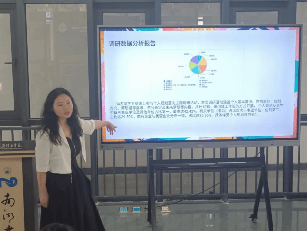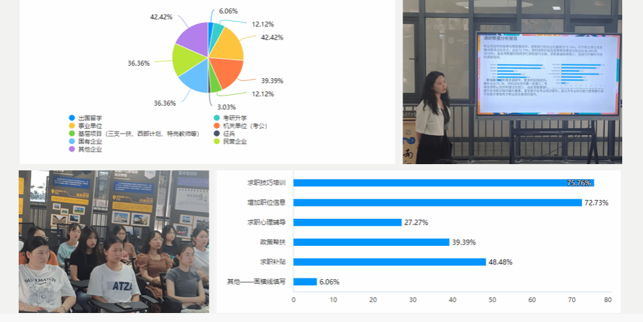活动伊始,张婷老师针对调研数据进行了详细的分析报告,个人规划及意向中备考事业单位及其他单位占比第一,最高达42.42%,机关单位(考公)占比仅次于事业单位,位列第二,占比达39.39%;职业规划中的指导与帮助需求中,求职技巧培训占比最高达75.76%,对于职业岗位信息推动需求占比次之,占比72.73%,由此项数据可知同学们求职技巧欠缺,求职渠道知晓甚少,后续可开展针对性的讲座培训;