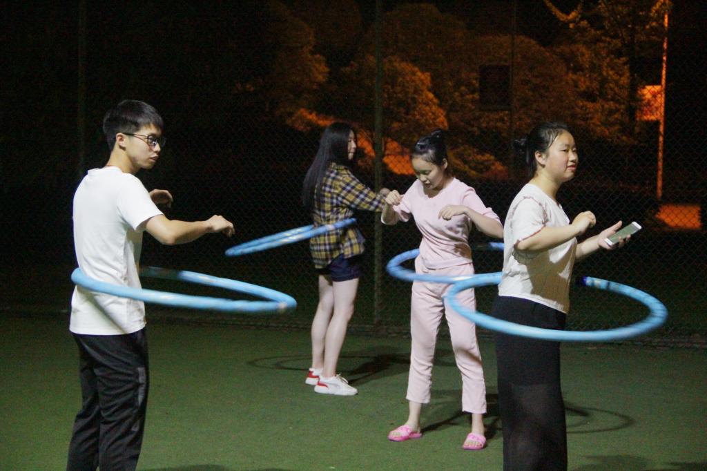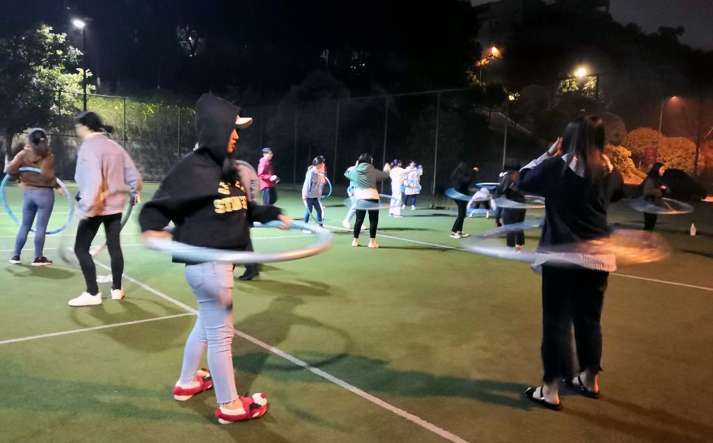 相信运动这个词大家都不陌生,有人曾说:“安乐给予人舒适,却又给予人早逝;运动给予人磨砺,却又给予人长久。”正所谓生命在于运动。呼啦圈活动也给了同学一个约束自己的机会,尽管如今天气逐渐转热,但每当到了周三周四晚上,花果呼啦圈小队仍然会整整齐齐地聚集在A区网球场上。 在转呼啦圈的同时大家可以认识一群趣味相投的朋友,可以一起交流心得体会,也可以分享发生在自己身边的趣事等等。长期的打卡坚持使得同学们相互之间已经十分熟络,不同年级不同专业的小伙伴们俨然在这一次次的“旋转”中收获了难得的友谊。
