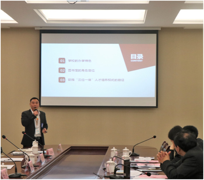 秦代辉馆长作为我校图书馆案例汇报人,从学校的办学特色、图书馆的角色定位以及助推“三位一体”人才培养模式的路径,三个部分进行了汇报,并用“资源共享、视野助推、团队互动”三个关键词进行了概括总结。