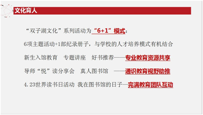 图书馆通过新生入馆教育、数字资源专题讲座、好书推荐等多种形式与学校的专业教育进行资源共享;更充分利用导师“悦”读分享会、真人图书馆为通识教育进行进一步的视野助推;4.23世界读书日活动、我在图书馆的日子等活动开展为完满教育的团队互动添砖加瓦。以上活动的持续开展,得到了大多数读者的认同和支持,基本上形成了“双子湖”系列文化活动的框架,也建构了与“专业教育、通识教育、完满教育”的融合。
