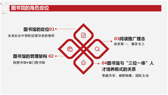 我校现已形成以“信息产业商学院”为学校定位,以培养“完整的人”为办学目标,以“专业教育+通识教育+完满教育”三位一体为人才培养模式,使学生成为未来社会中坚阶层的领导者”独具一格的办学特色。基于我校的办学特色,我校图书馆的定位是未来社会中坚阶层的领导者的智库,推广以“读者第一,服务至上”为主的阅读理念,形成了“以校图书馆为主,各学院图书馆、书院图书馆(室)、教职工图书室为补充”的管理框架。