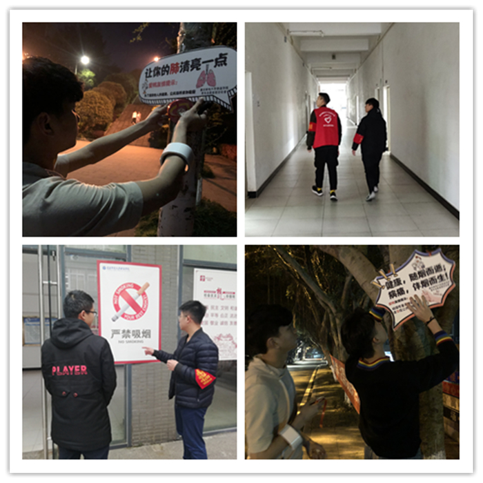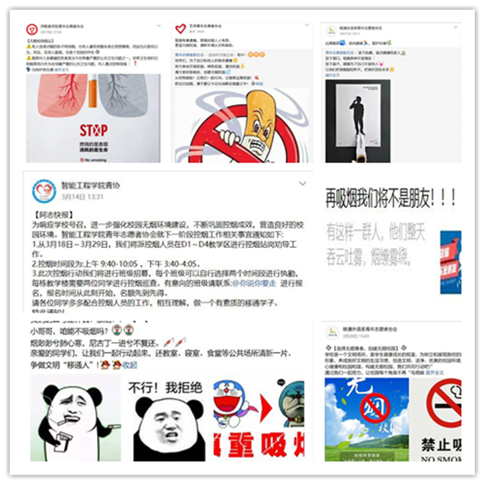 各院系青年志愿者协会公众号与官方QQ等新媒体平台纷纷开展控烟宣传活动,各种控烟宣传图出现在同学们的视野之中:各教学楼道、校园主干道、寝室楼等地方都贴有宣传标语与宣传口号,时刻提醒同学们要远离烟草,预防肺部疾病,远离癌症,崇尚文明生活。