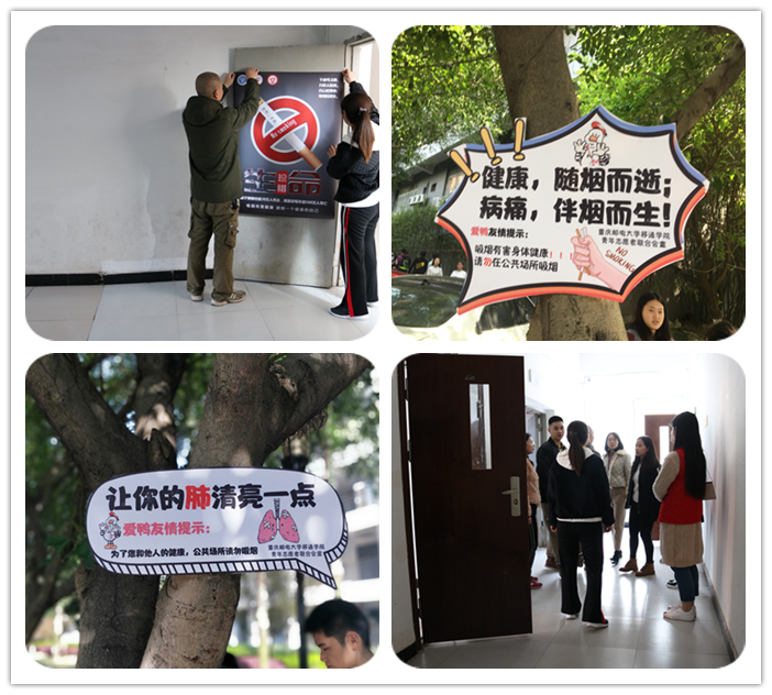 为进一步加强无烟校园建设,不断巩固控烟成效,提高青年学生对烟草危害的认识,引导学生自觉养成文明卫生习惯,根据《关于进一步落实“无烟校园”建设的通知》(移通院﹝2018﹞180号)、《关于开展“无烟校园,创文合川”系列主题活动的通知》(移通院﹝2018﹞184号)文件相关要求,助力学生健康成才,建设和谐校园,校青联与各院系青协自主开展了有关“无烟校园”建设活动,营造绿色、洁净、文明的无烟校园环境。