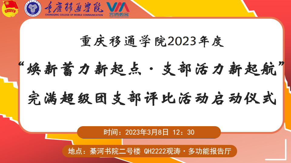 2023年3月8日12:30,“焕新蓄力新起点,支部活力新启航”2023年度完满超级团支部双校区评比活动启动仪式分别在下里巴人剧场、綦河书院QH2222观涛·多功能报告厅拉开序幕。参加本次启动仪式的嘉宾有党委、各完满教育职能部门、学院、书院的老师代表,校院两级学生组织及各基层团支书代表莅临现场,双校区参与人员共计600余人。