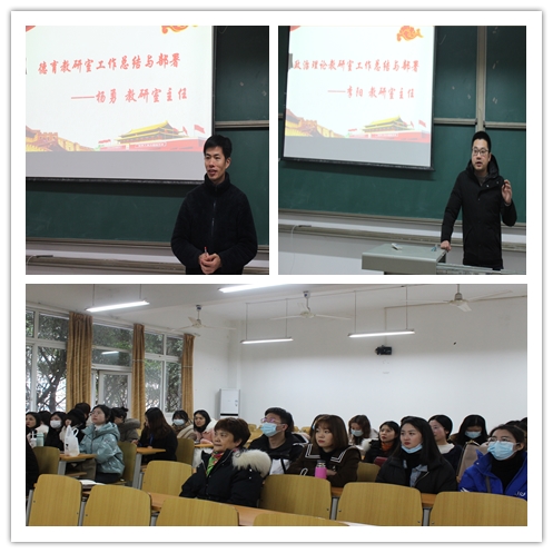 首先,政治理论教研室主任李阳,德育教研室主任杨勇,分别从课程建设、教学改革、与完满教育的融合、教师培养培训等方面对今年的工作进行了总结。今年各教研室紧密围绕学校总体工作思路,认真贯彻学校发展战略,以提升思政课的教育教学实效为目标,不断夯实基础、改革创新,各项工作稳步推进,取得了不错的成效:《思想道德与法治》被认定为重庆高校线上一流课程,《马克思主义基本原理》《中国近现代史纲要》课程被立项为校级精品课程,截至目前,两个教研室都评上了“优秀教研室”,四门思政课主干课程均被认定为校级及以上精品课程。思政教学部还结合学校完满教育理念携手书院部协同育人工作的扎实开展,还有教师在重庆市微课比赛和党史宣讲比赛等竞赛中都取得可喜成绩,2021年,在思政教学部全体教职工共同努力以及卓有成效的工作下,大家收获颇丰。