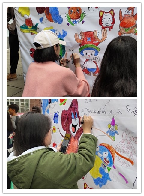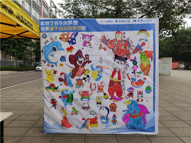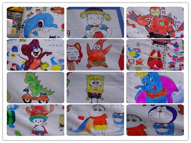 超大的画布汇聚了同学们的爱心涂绘,为孩子们绘出多彩的世界,钢铁侠、哪吒、海绵宝宝、小飞象等等小朋友喜欢的卡通漫画形象经过同学们的画笔加工,渐渐呈现在画布上,组成了这幅寄托我们爱心和善意的画作。