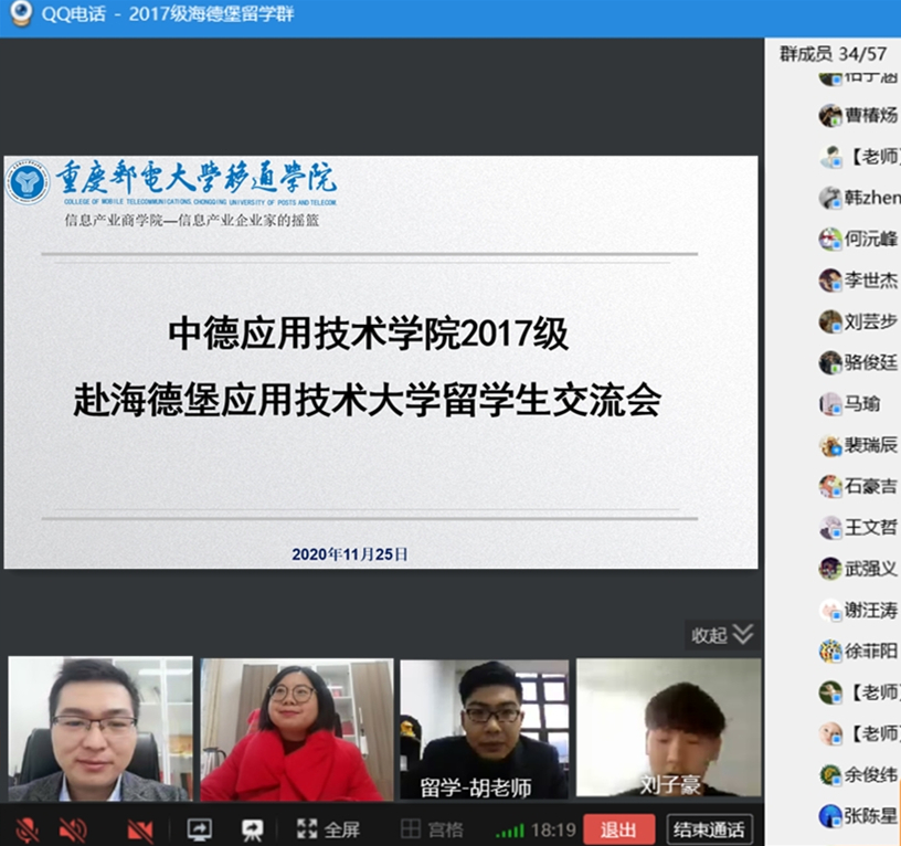 走过三年的艰苦求学,历经层层选拔,经过漫长的申签等待,34名中德学子即将在11月底开启憧憬已久的德国求学之旅。11月25日16:00召开了2017级赴德国海德堡应用技术大学留学生线上交流会。中德学院副院长武强义、侯宇晶,国际处副处长毛敏,辅导员魏元明,2014级学长刘子豪及34名预赴海德堡应用技术大学的全体学生参加此次会议,会议由学工办主任黄景龙主持。