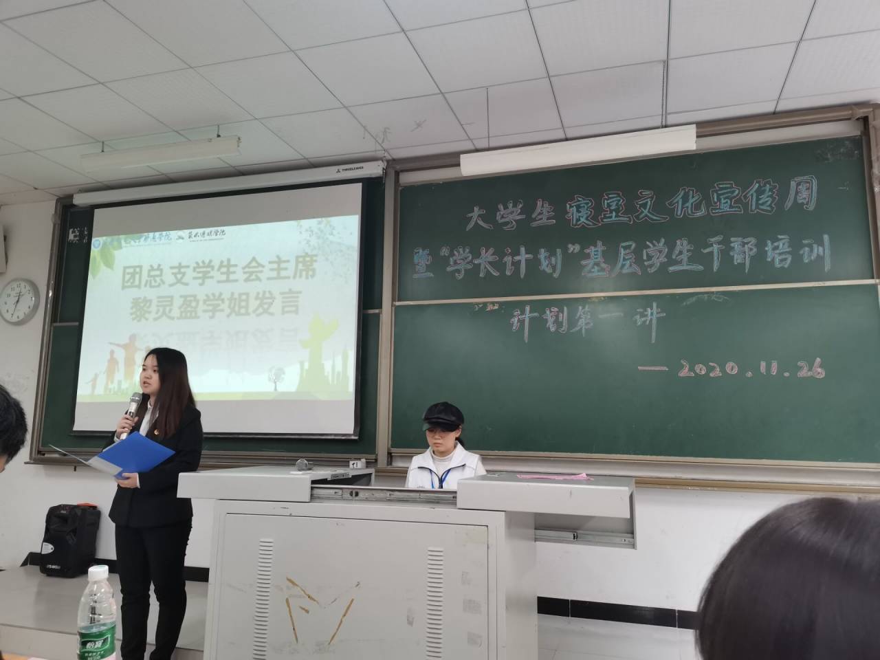 11月26日,由我校艺术传媒学院生学生会主办,权益部承办的大学生寝室文化宣传周启动仪式暨2020级基层学生干部培训第一讲在4101教室隆重举行。艺术传媒学院李克伟副院长、2020级辅导员卢伯年老师、安珈璇老师、2019级辅导员黄小梅老师以及学院2020级全体基层班干部和寝室长代表共计180余人参加了本次启动仪式。