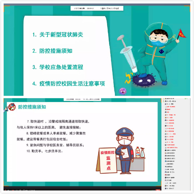 6月1日,2018级动画、数字媒体艺术专业,2017级广播电视编导专业分别展开线上主题年级会,向各专业学生解读学校疫情期间防控要求和各项管理制度规定。2018级动画、数字媒体艺术专业结合学校封闭式管理情况,重点强调每日晨午检和体温测报工作、按要求安排好学习、工作和生活,以及在校期间出现发热情况等应急处置方式。