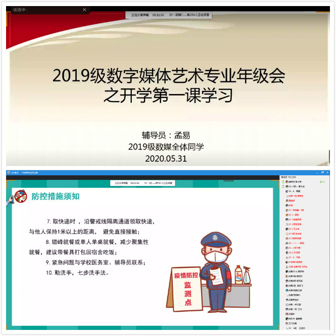 6月2日,2018级广播电视编导专业、2019级动画专业、2017级动画、数字媒体艺术专业同样以线上年级会的方式积极开展“开学第一课”,从防控政策知识培训、校园安全与学习生活等方面引导广大学生正确认知国家的疫情防控形势与政策,切实遵守学校疫情防控各项管理规定。