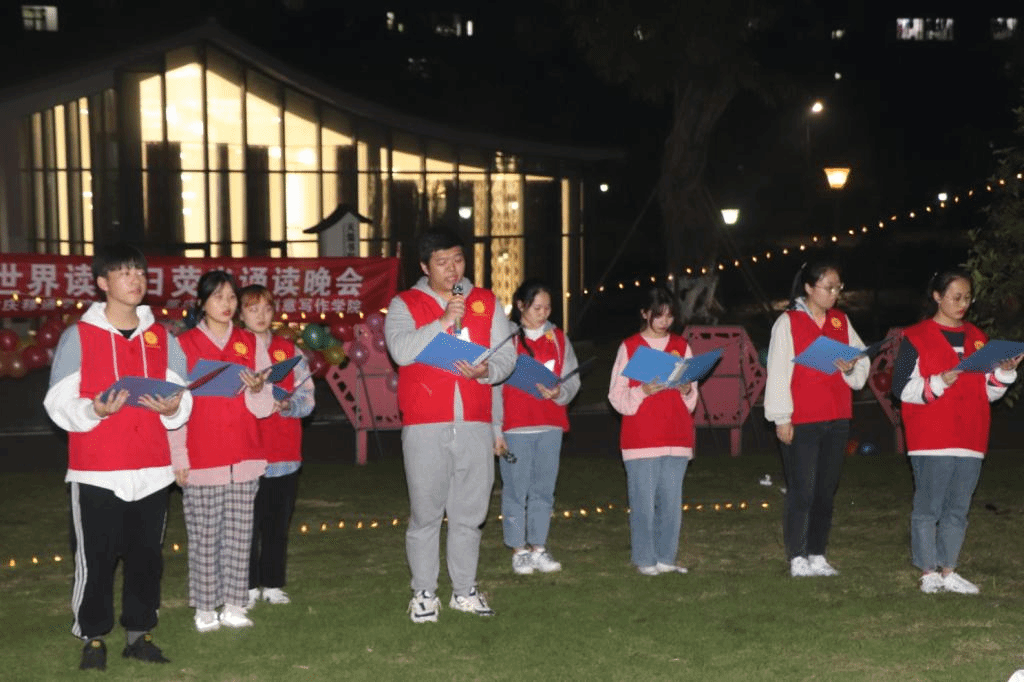 荧光诵读会,传阅读文化。4月23日晚,天渠书院外草地上一场别样的阅读文化推广活动吸引了200余名师生观看。以朗诵、三句半、歌舞等形式推广阅读文化。