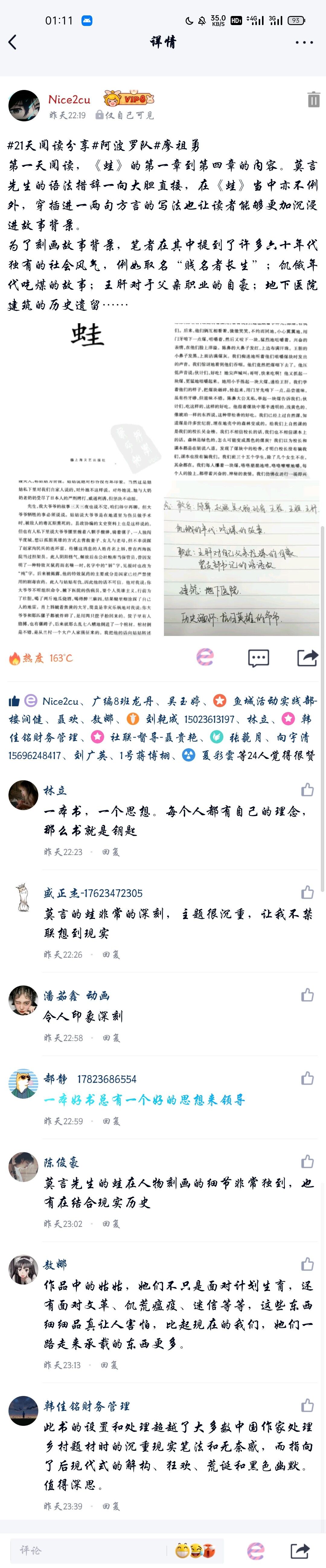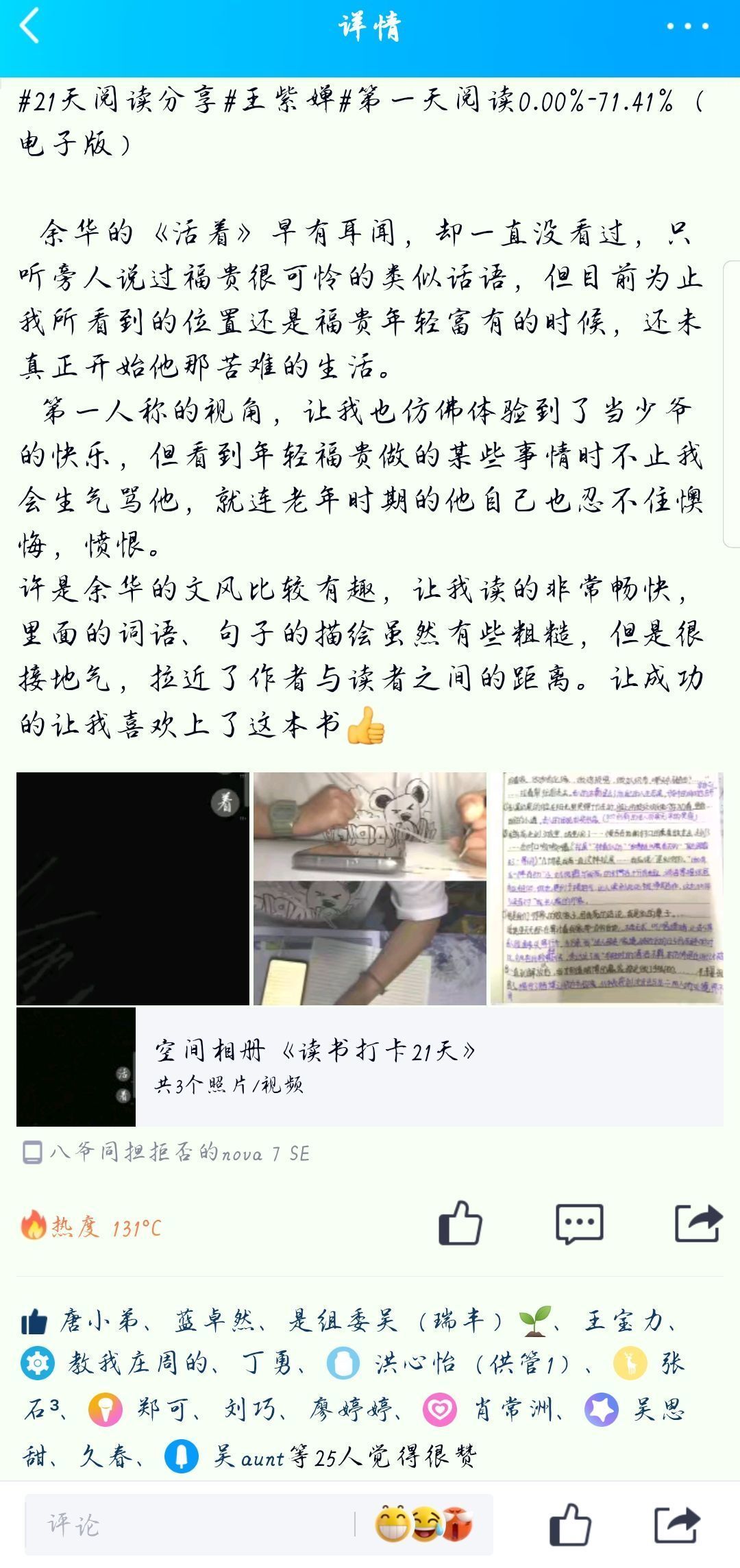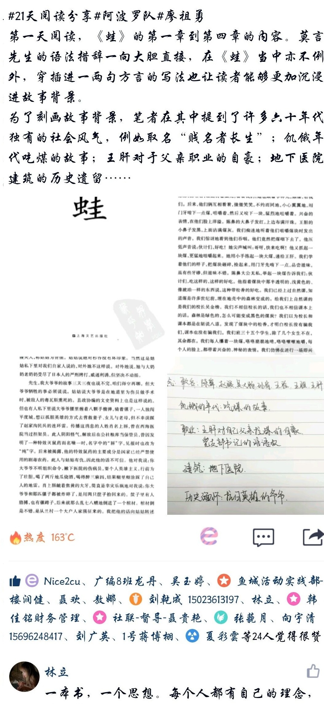 创意写作学院方刚老师提到,“‘带你阅读21天心得分享活动’每个人每天集赞30个,21天就是630个赞。140名参赛学生在这21天中,不但自己坚持阅读,养成读书习惯,同时用自身的践行鼓舞和影响着身边6万+人次的关注和点赞,从而打造文化校园、文化沉浸的阅读环境。”