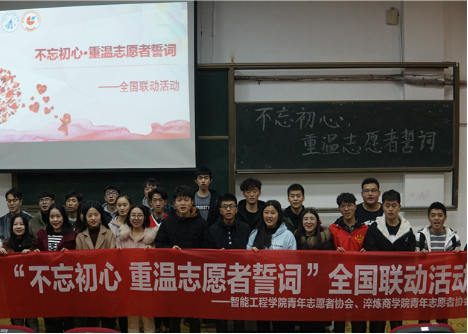2018年12月10日,淬炼商学院与智能工程学院在3202联合举办“不忘初心,重温志愿誓词”全国联合活动。本次活动到场嘉宾有淬炼商学院志愿服务指导老师——马莉老师、熊斌老师,智能工程学院志愿服务指导老师——张颖超老师、郭超然老师。