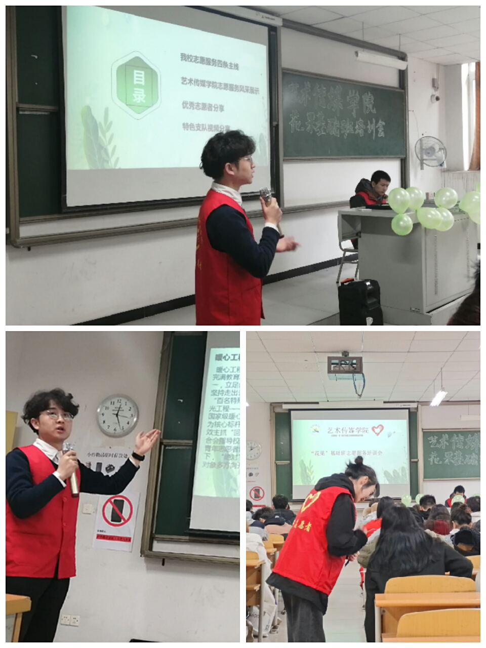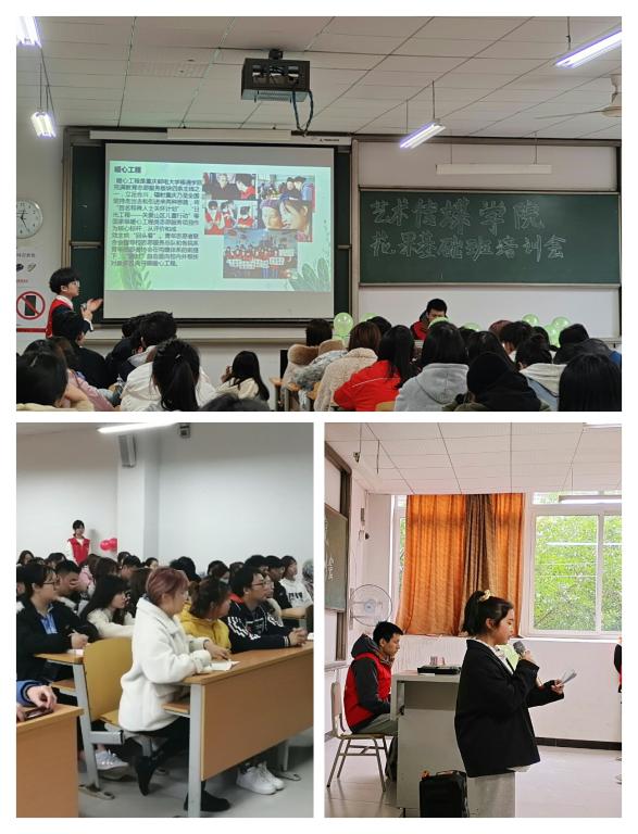 为提高志愿者服务理念与服务意识,促进志愿者了解我校及我院志愿服务工作,增强志愿者的责任心,实现我院志愿者服务活动健康、有效、长期的发展,艺术传媒学院青年志愿者协会于2020年11月27日在4203教室开展“花果”志愿服务基础班培训第二讲。本次活动通过知识讲解、实践分享、互动等方式将“我校志愿服务四条主线、志愿服务风采展示、优秀志愿者分享、特色支队视频分享”相融合,得到不错反响。