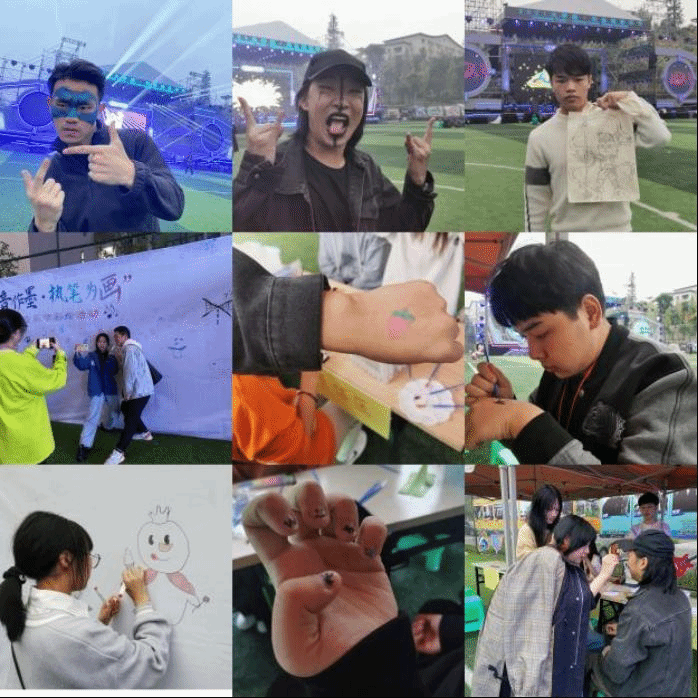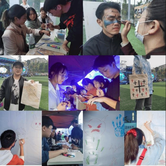 本次音乐节外围活动参与人数接近500人,累计参与项目1500项左右,涉及的人群从小朋友、同学到老师,这其中不难发现优秀又有个性的彩绘作品,它们展现在同学们的脸上、手上和展板上,这是视觉和听觉“碰撞”所发出的色彩。在展板上,细心的人会发现色彩与色彩的缝隙中有些字眼格外亮眼,那是同学们对自己大学生活的期盼和美好祝愿。