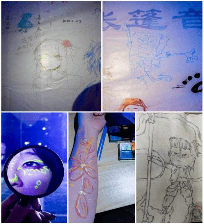 听说音乐节与色彩更配哦!在本次活动中,同学们纷纷拿起画笔,在手上、脸上、展板上留下了自己心中音乐的痕迹,或是简笔画,或是动漫人物亦或是一个五彩缤纷的手掌印。令人眼花缭乱的色彩与节奏感十足的音乐相得益彰,随着灯光的闪过,荧光颜料也焕发出别样的色彩,仿佛加入了这躁动的场合,随着同学们一起挥舞着双手,跟着音乐一起跃动。