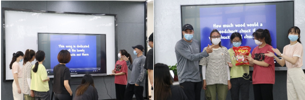 碎片全部拼成,各个小组开始进行挑战,能以最快速度完成绕口令的组会获得格外的奖励。为了让同学更好的进行发音,田老师和外教Peter带领着同学们共同进行练习,在最后更是将绕口令融入歌曲中进行演唱。