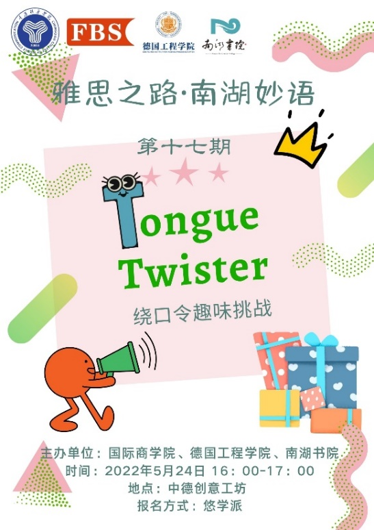 五月是各类语言等级考试的备考月,为了提升学生的语言学习兴趣,提高学生的口语练习热情,以“知识性、趣味性、实践性、自主性”为原则。5月24日下午,由国际商学院、德国工程学院、南湖书院联合主办的主题为“舌头打结,绕口令趣味挑战”的第十七期雅思之路·南湖妙语在中德创意工坊顺利开展。