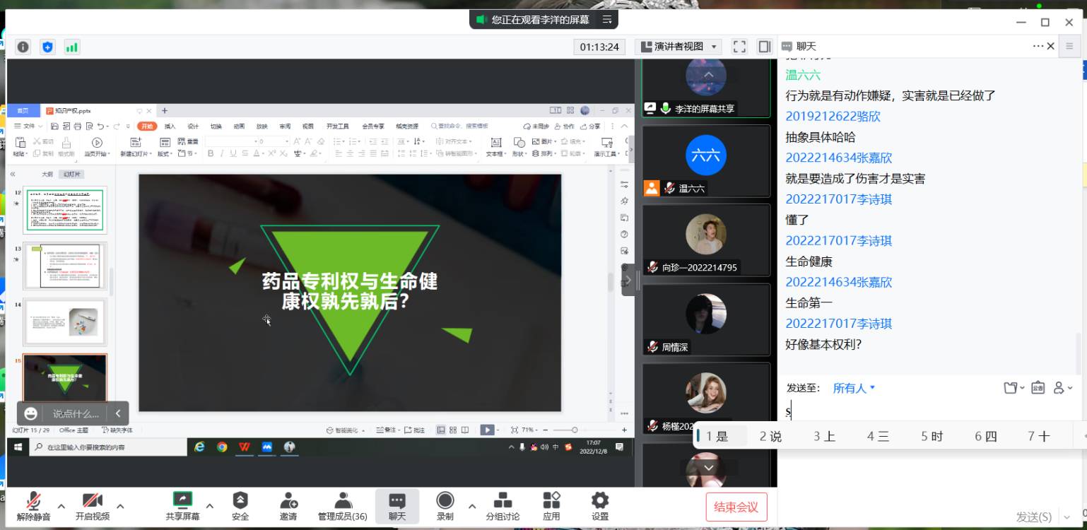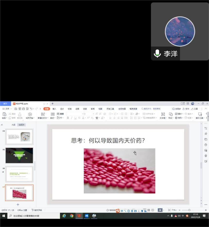 李洋老师为我们总结了为何药品如此之贵,首先在TRIPS签订后,规定其成员须为医药产品和制造方法发明授予专利。这在保护药品专利权的同时,使得专利药品的价格大幅上升,可获得的廉价通用药品的范围大幅减少。其次,随着科技的进步,一系列药品对人体危害大幅度降低,药品常年强势“霸榜”。在这一系列的共同影响下,价格也在不断地提高。最后,一盒药从生产出来到消费者手里,有层层的代理关系,如省代理给市代理,市代理给医院等。每一层代理都有利润的空间,药价自然而然也就进一步被提高。
