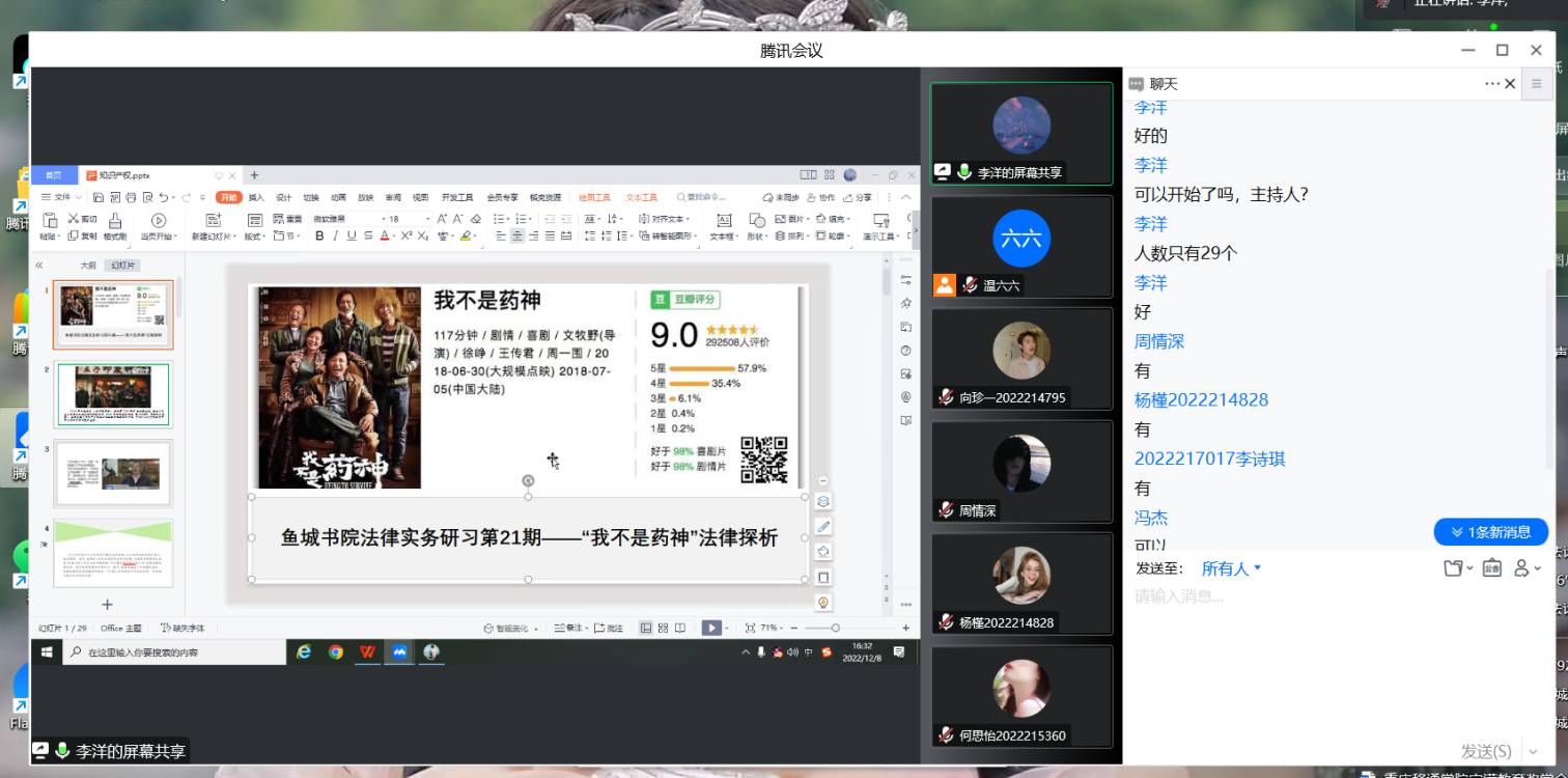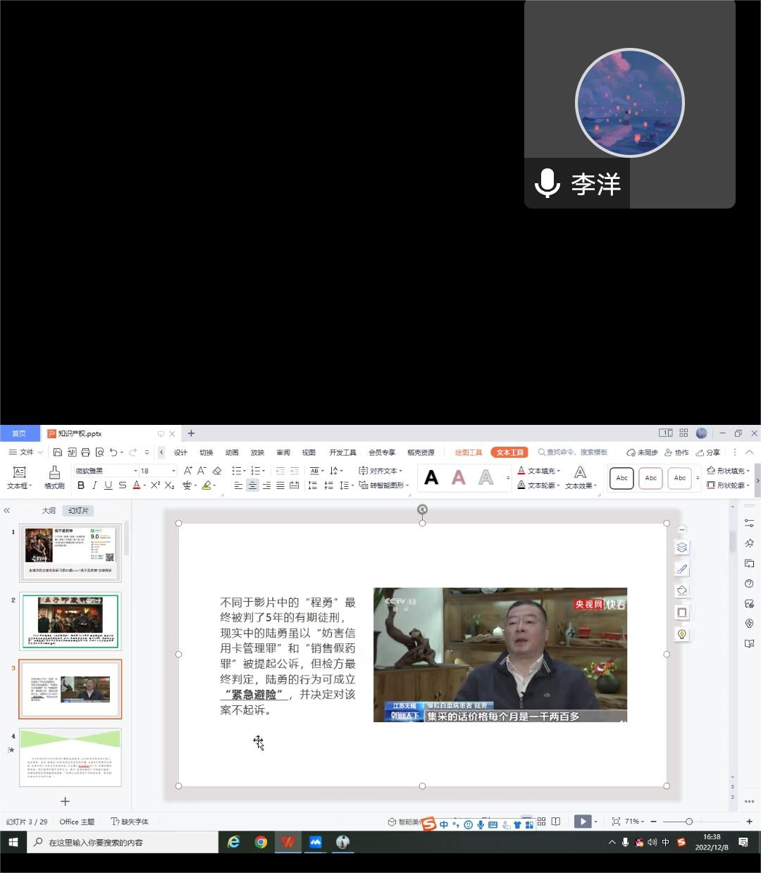 在活动中,李洋老师与同学们探讨此案件的矛盾所在。⼀边是知识产权对药品生产和销售的保护,⼀边是迫于经济压力购买廉价仿制药品的白血病患者。“陆勇案”体现出的正是司法与伦理相冲突时的窘境,他犯法了,走私罪,这是无可反驳的,这样可以定义他是“坏人”,这是法律所在。自己垫钱买药再低价卖出,拯救了无数因买不起药而对生命失去希望的普普通通的百姓,这样看来他是个“好人”,这是人性所在。法律和人性我们无法确定孰先孰后,但是我们心中要有天平,我们不能违法,也不能失去人性。德国著名哲学家黑格尔曾在《法哲学原则》一书中说道:“法律并非一成不变的,相反的,正如天空和海洋因风浪而起变化一样,法律也因情况和时运而变化。”法网柔情需存在,温情执法要谨慎。