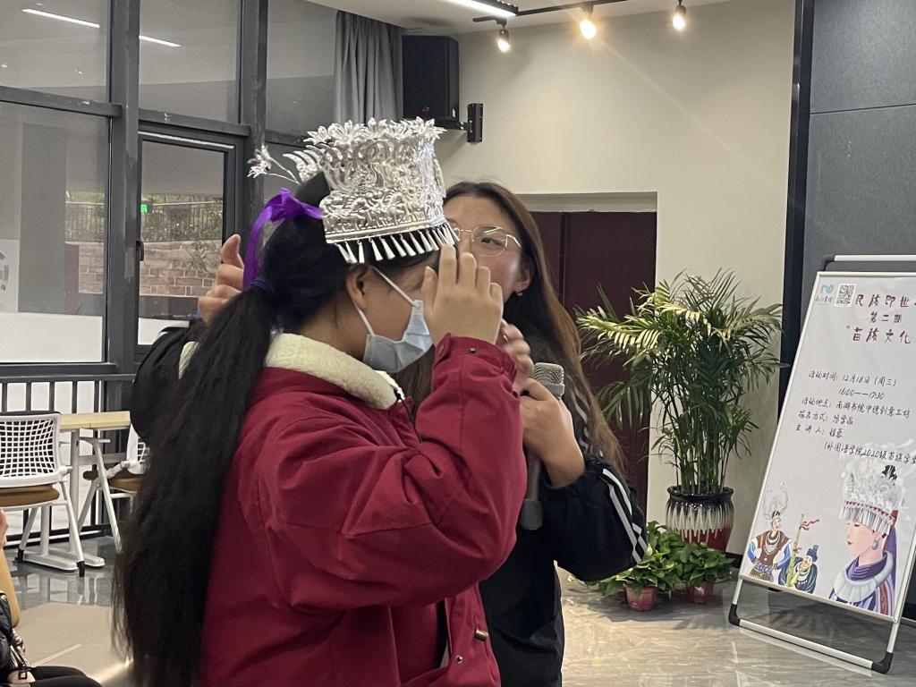 “这是我第一次在这么多陌生人面前分享,很开心能借助南湖书院民族即世界这个活动让更多的同学了解我们苗族特色,一起探讨文化传承的方式。优秀的传统文化不仅是民族文化的载体,也是新时代新文化的基石。大家与我积极地互动让我放松不少,我感受到了文化传承的快乐,这也激励着我以后在传承的同时不忘创新,赋予传统文化现代意义,推动创新发展。”活动最后,程蓉与同学们分享了自己的主讲感受,鼓励同学们树立民族自信和文化自信,在世界文化之林传承弘扬优秀传统文化。
