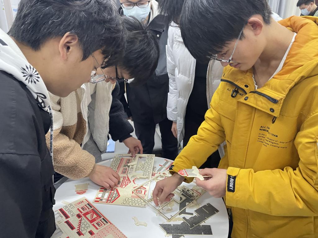 随后,同学们一起通过3D吊脚楼拼图感受了吊脚楼的建筑工艺,并提出“苗族旅游现状如何?”“苗族文化传承”等问题,程蓉同学以吊脚楼为例,为同学们讲述了不少苗族景区以吊脚楼住宿体验为旅游特色招揽游客,再加以苗族、苗银等手工艺品的售卖,推动经济创收的同时,进一步对外宣扬了苗族特色传统文化。