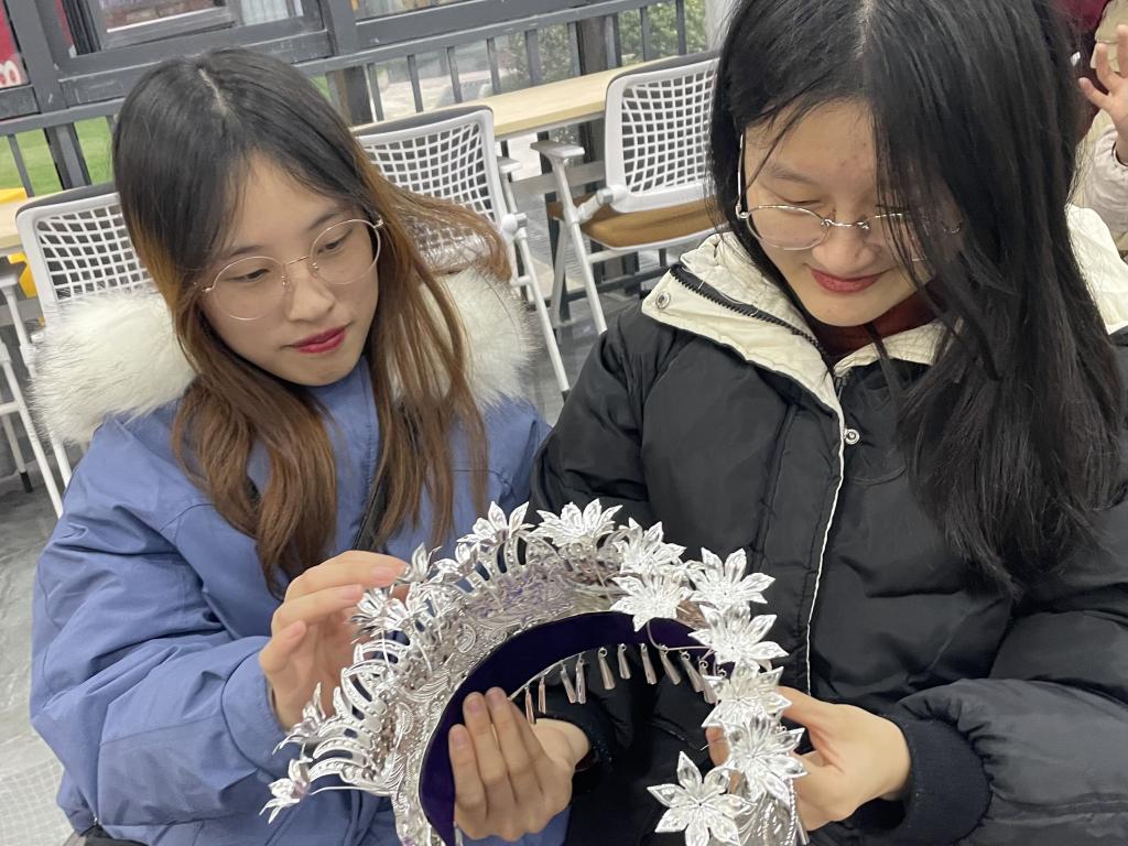 杜甫曾经写下了“五溪衣裳共云天”的诗句,来描述苗族种类繁多的服饰文化——苗族妇女的服装有百多种样式,仅插在发髻上的头饰就有几十种。为了让同学们能够更加直观的感受体会到苗族特色,程蓉特地将苗银发饰和苗绣带来了活动,邀请现场同学们体验观摩。