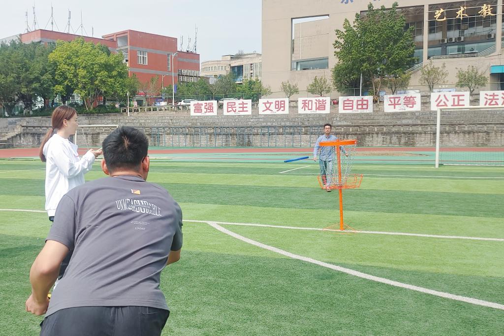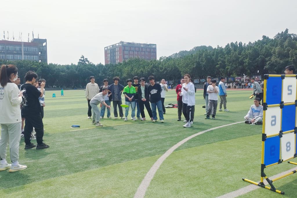 抓不住春天的风,那就拿捏住飞盘的快乐。随着王老师一声令下,一场没有裁判的趣味飞盘挑战赛正式拉开帷幕。参与学生随机分为3队,依次进行飞盘高尔夫、飞盘保龄球、飞盘九宫格3项比赛。“飞盘九宫格”,考验同学们手脚协调能力!自由评估哪个格子易得分?冲高分,还是选择稳赢政策?瞄准目标宫格,看准时机再出手,看似简单的飞盘游戏,处处锻炼着平衡性和力量感;“飞盘高尔夫”让同学们在自由投掷中,释放春天的活力;“飞盘保龄球”在协调性的前提下,正确将目标击倒,考验着同学们的集中度和空间感。以“盘”会友,无接触社交、团队协作、抗压能力通通Get!经过激烈角逐,第一小组获得本次趣味飞盘赛的胜利。