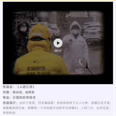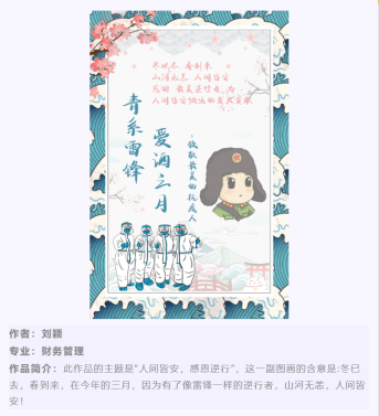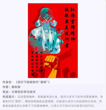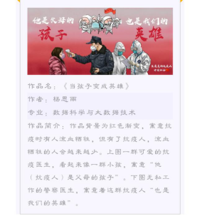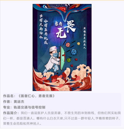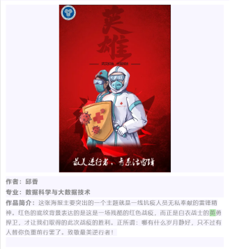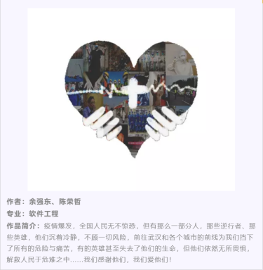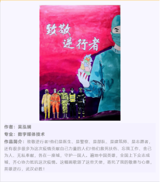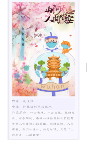 在活动刚一启动,就受到了广大同学的支持与积极参与,丰富多样的参与形式为同学们的参赛提供了更多的可能,方便了同学们更好表达自己对抗疫人的崇高敬意。在活动期间,累计收到来自各个院系数17幅作品,同学们用自己的方式向抗疫前线的人们表达着自己的敬意。