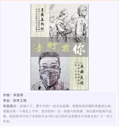 在此次活动中,涌现出许多优秀的创作作品,这场没有硝烟的战争中,平日里的白衣天使都是如今的抗疫战士,防护服是他们的盔甲,医用器械是他们的武器弹药。从那一幅幅作品里,传达出对前线英雄们的敬意,愿前行的逆行者们平安健康。