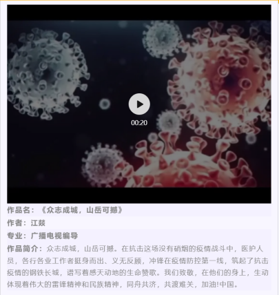 在进行了四天的线上作品拉票以及各个院系青协负责人的严格评选后,为期两周的公益广告征集大赛于4月6日拉下帷幕,为前线的抗疫人发声,激起了同学热烈的创作热情,活动主题使得线上活动也格外有力量。在这特殊的防疫期间,公益广告征集大赛不仅仅解决了同学们在家无法出门的乏味生活,也成功地呼吁了同学们对前线英雄的关注,用自己的方式和创作去传递力量,致敬了那些最美抗疫人。该活动也让同学们通过新媒体平台拉近了与抗疫人们的距离,了解了他们的辛苦与不易,传达了自己的情感与关心。致敬前线的最美抗疫人也一度成为QQ空间和朋友圈的热门话题。疫情当下,隔离病毒,但不隔离爱,为那些可爱的抗疫人们致敬!